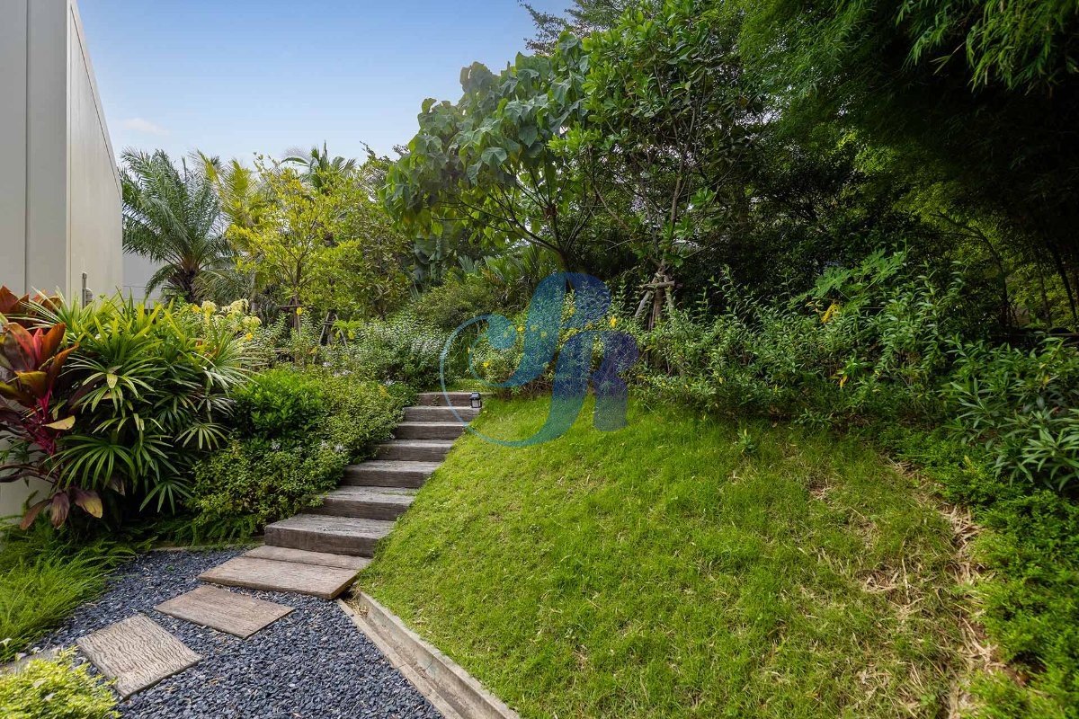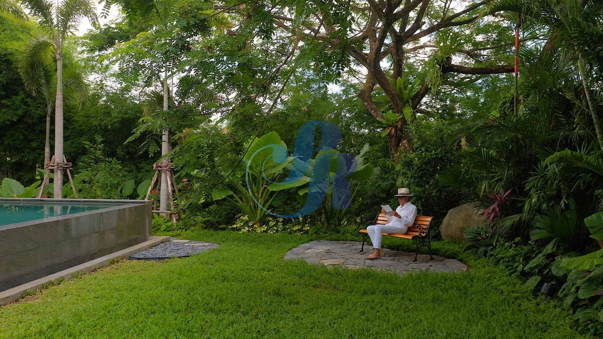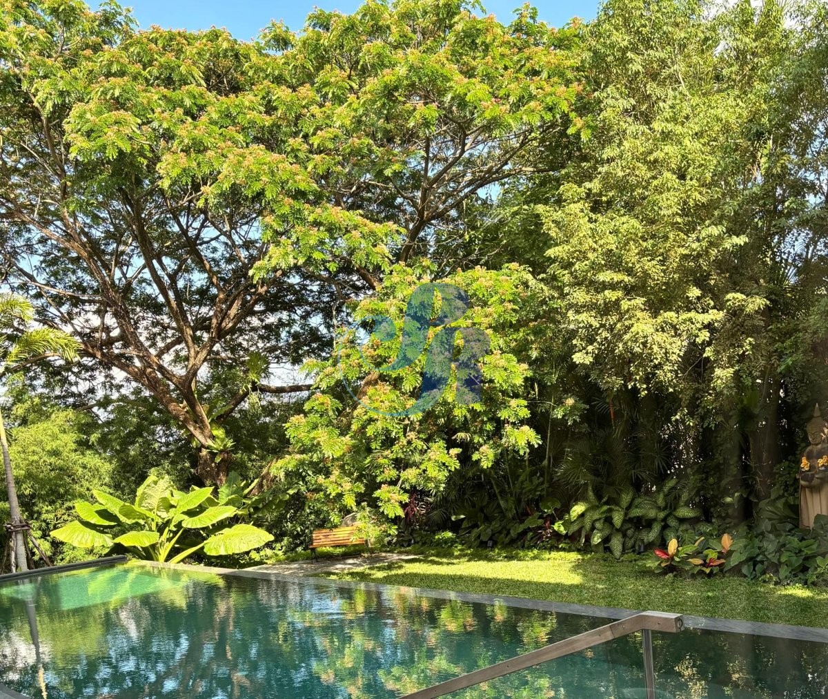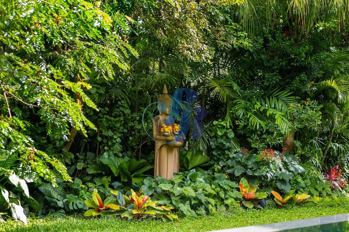Outdoors, a 13-metre saltwater infinity pool anchors the sun terrace, ideal for lounging or entertaining under the tropical sky. Mature palms, a grand Rain Tree, and rare Siamese Rosewood trees surround the gardens, ensuring privacy and serenity. A stone Buddha and winding flagstone paths add to the villa’s tranquil ambiance.