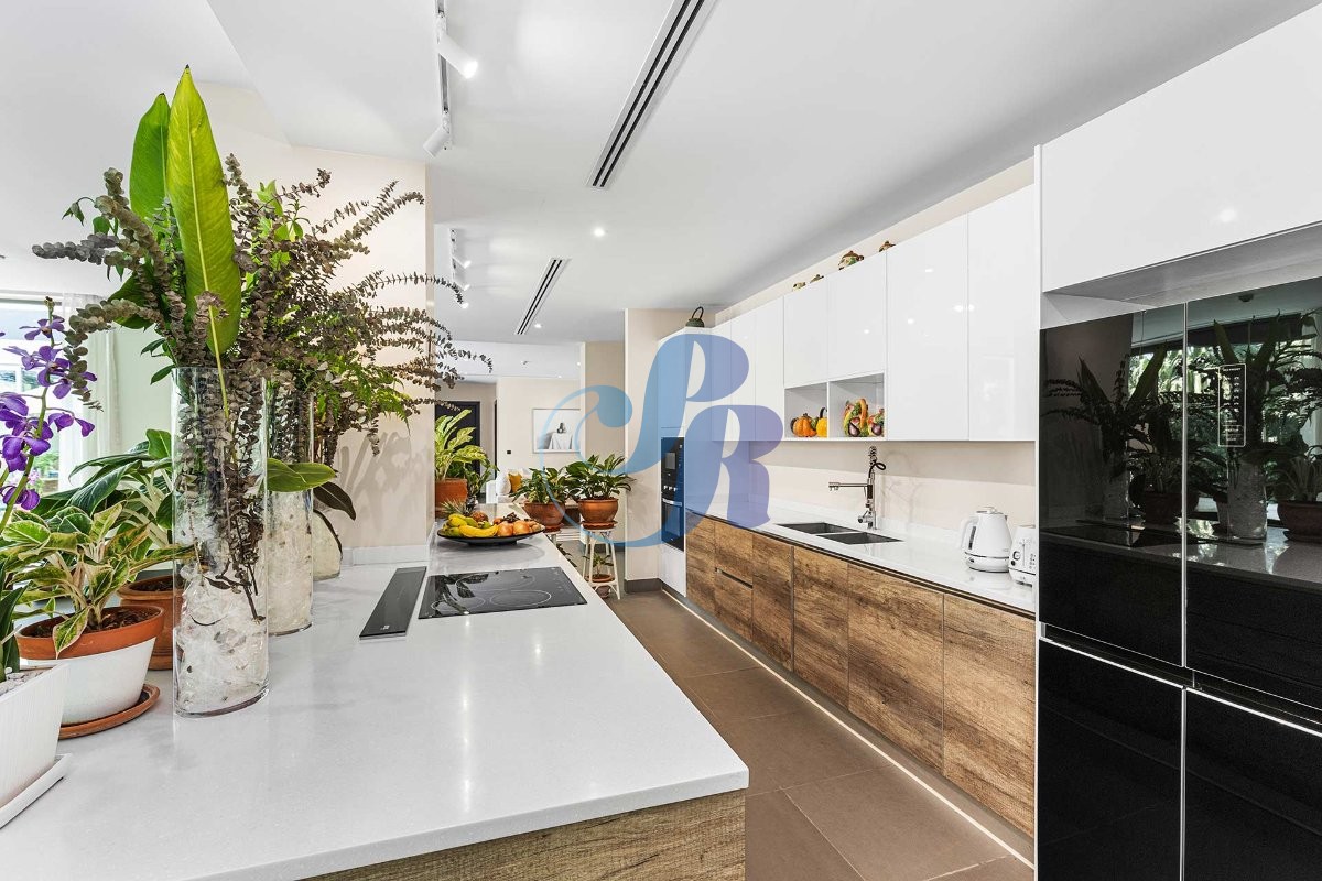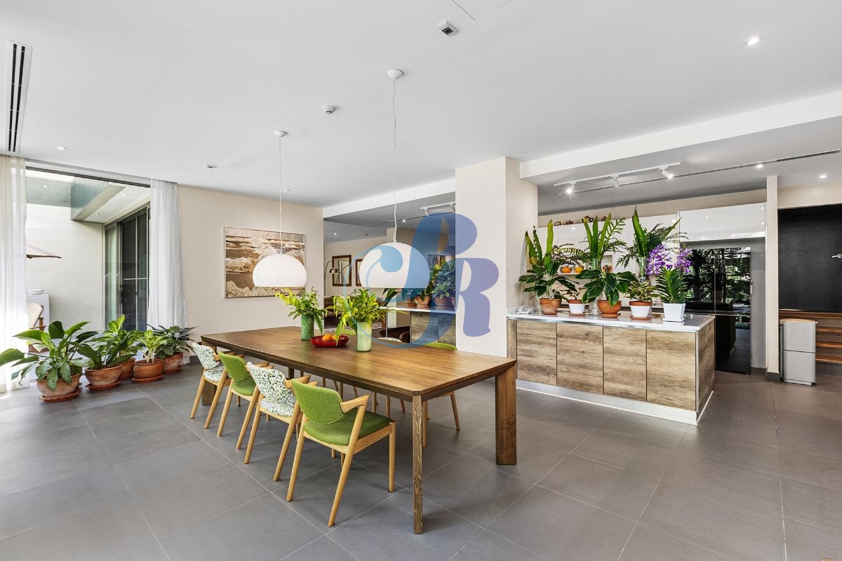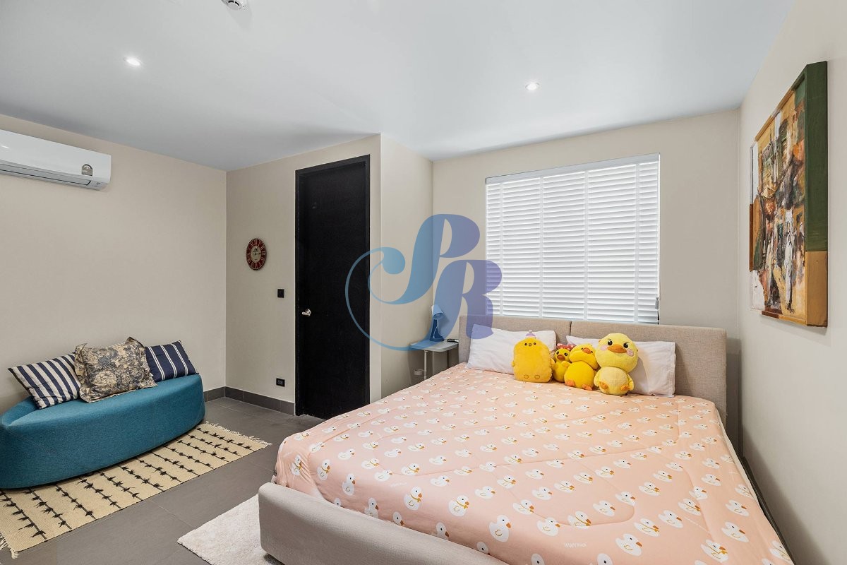 The ground floor opens to a bright, open-plan living area featuring a designer kitchen, central island, and formal dining space. A 42-sqm entertainment lounge flows onto the pool terrace through full-height glass doors, offering effortless indoor–outdoor living. Two guest bedrooms with private bathrooms enjoy direct garden access, while a Thai kitchen, pantry, and maid’s area add everyday practicality.