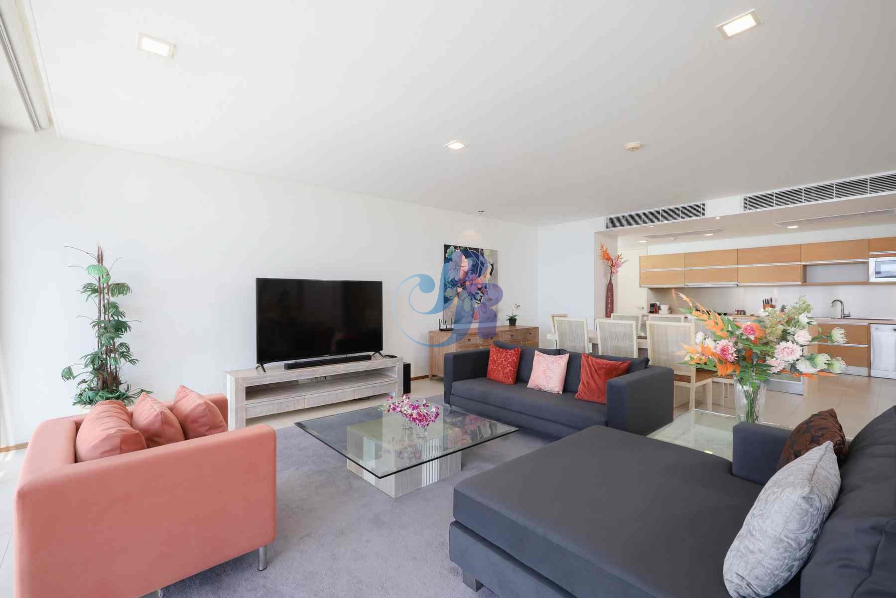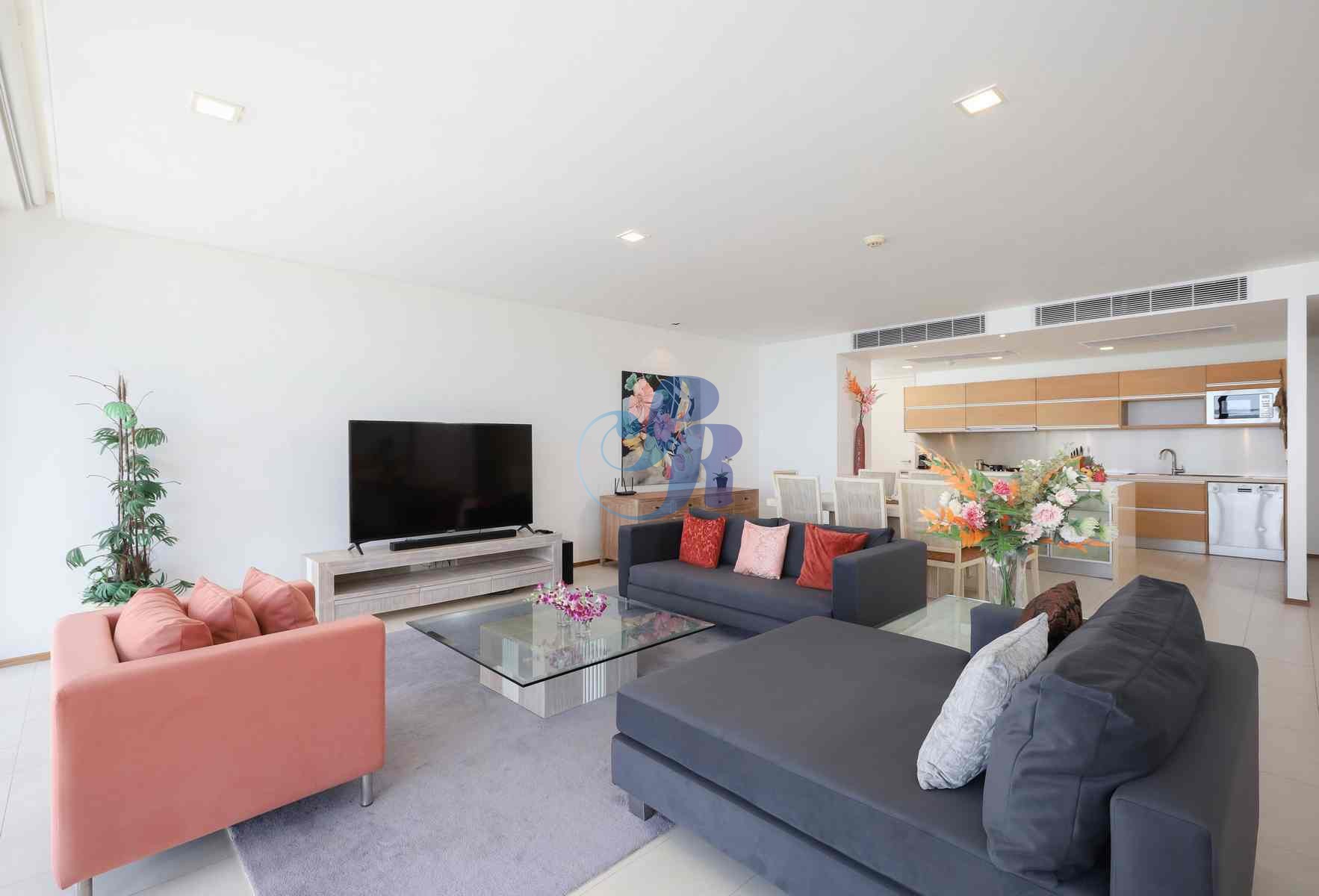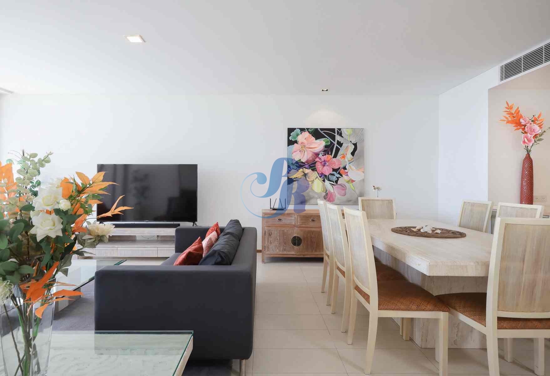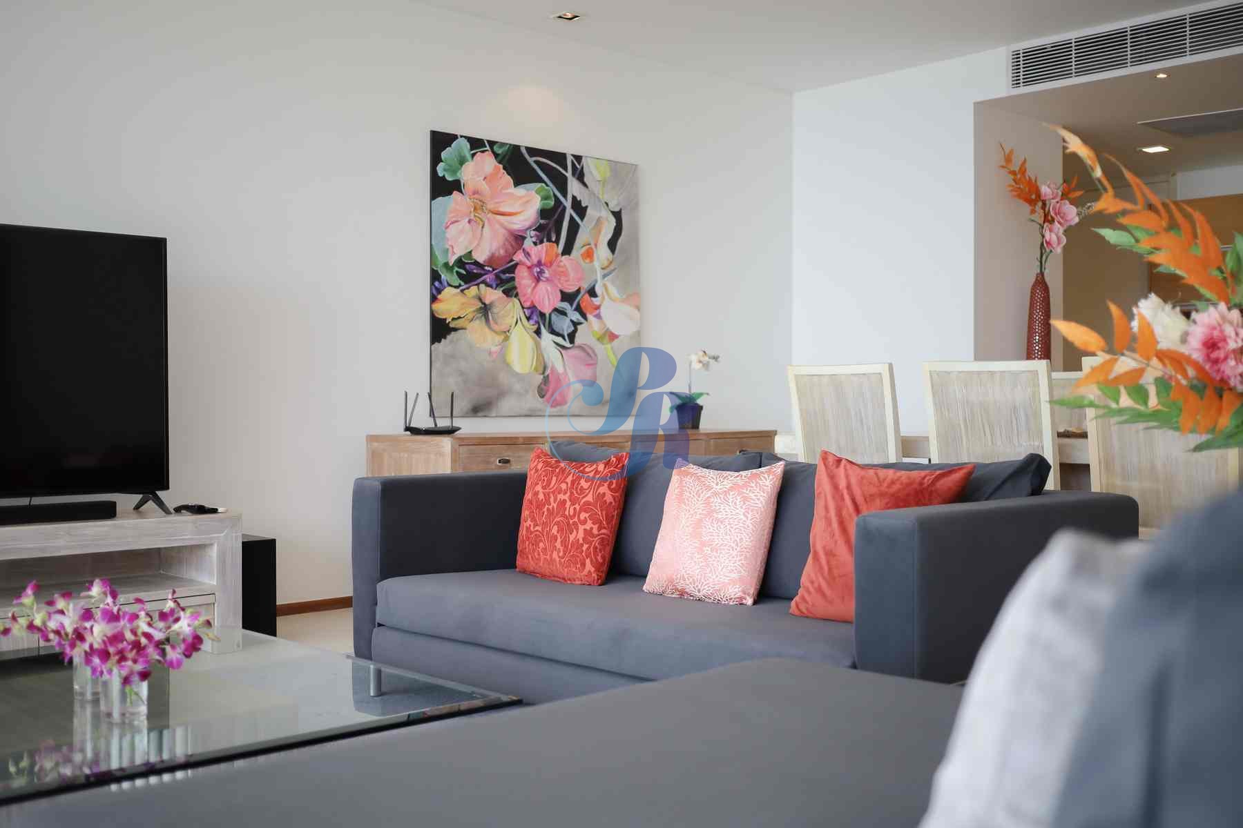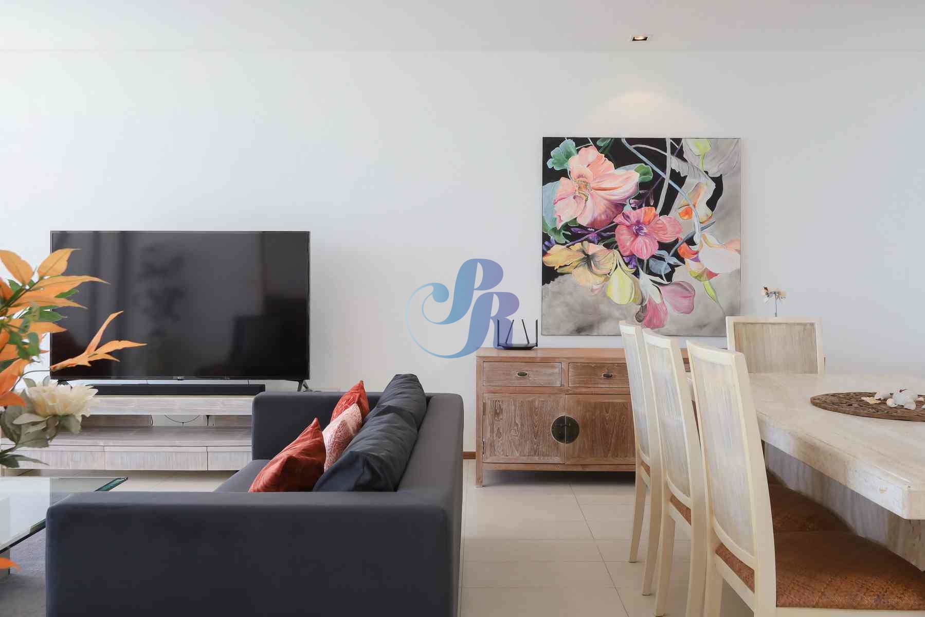 This elegant two-bedroom apartment spans 226 sqm with seamless indoor and outdoor living areas. The living room is tastefully furnished with a comfortable sofa and large TV, complemented by natural light through floor-to-ceiling sliding doors.