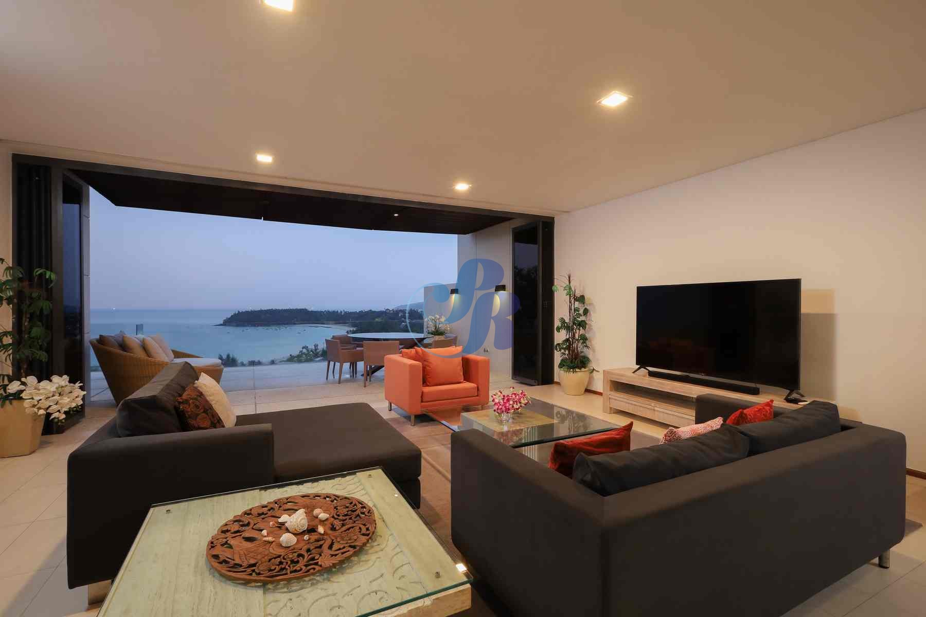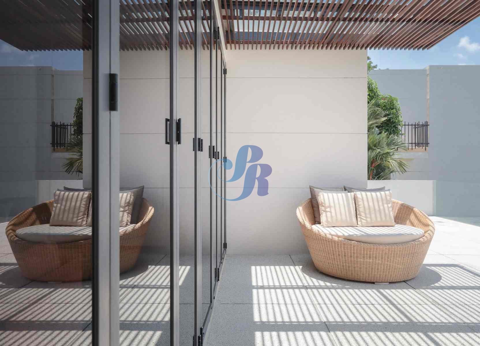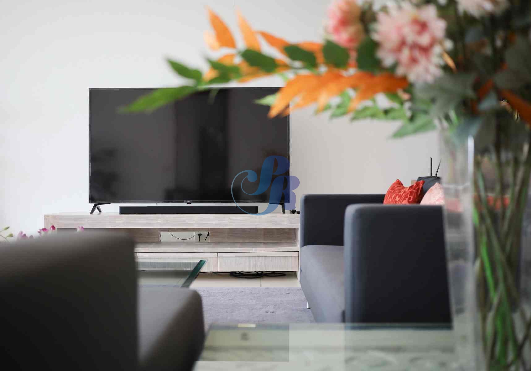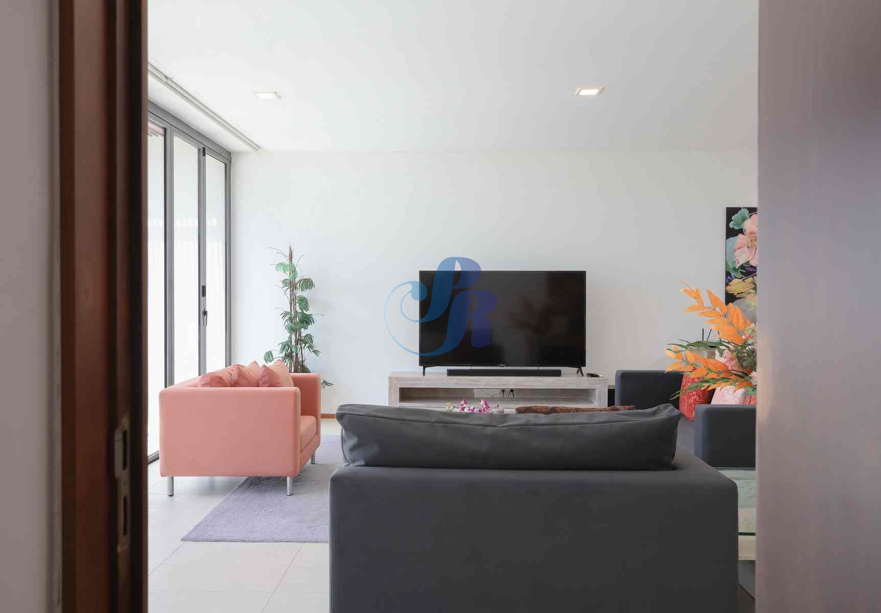 This elegant two-bedroom apartment spans 226 sqm with seamless indoor and outdoor living areas. The living room is tastefully furnished with a comfortable sofa and large TV, complemented by natural light through floor-to-ceiling sliding doors.
