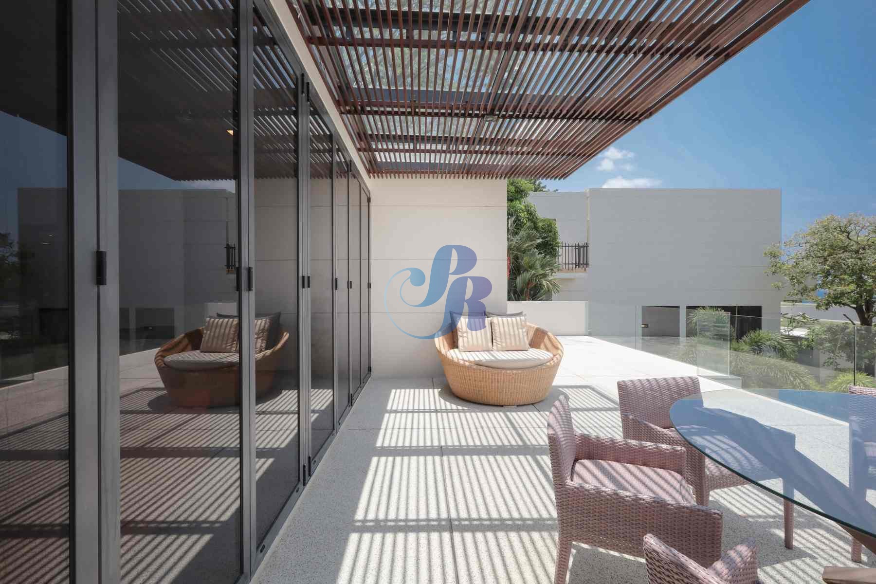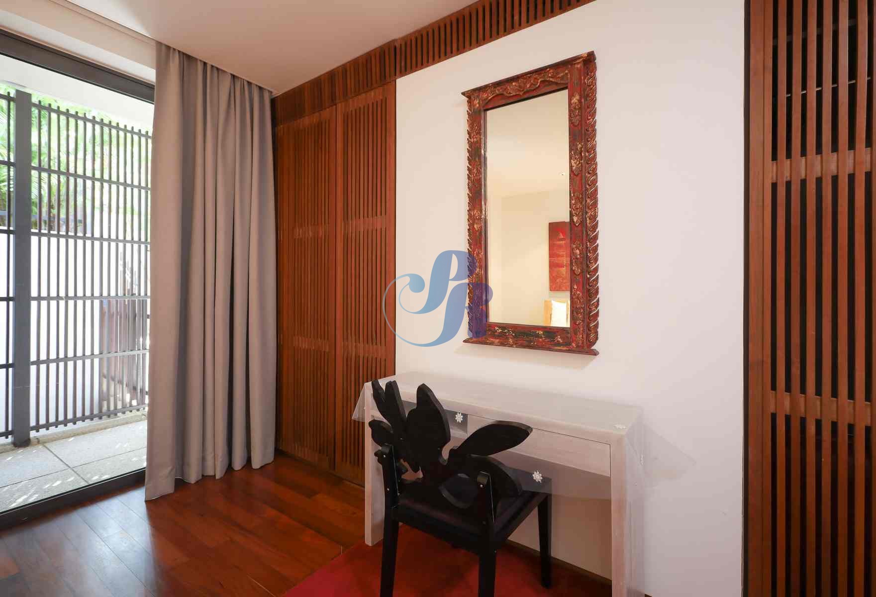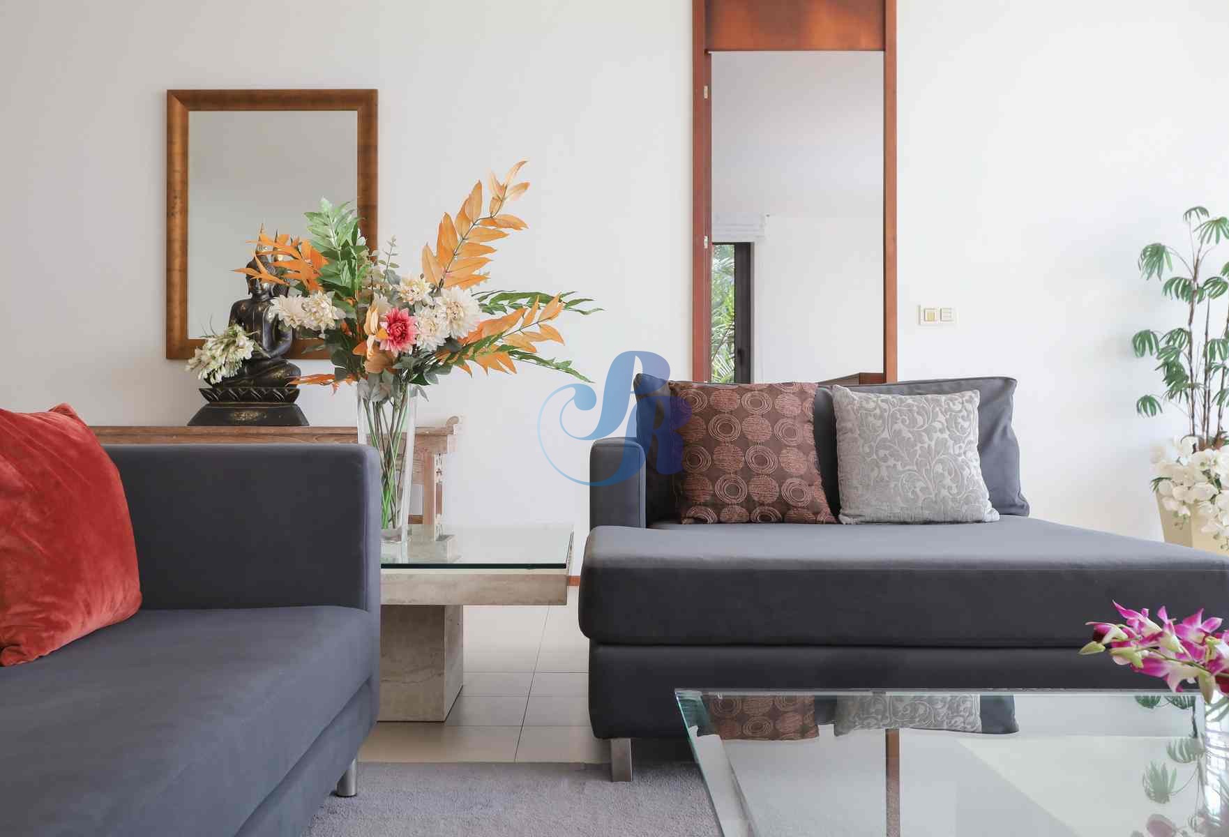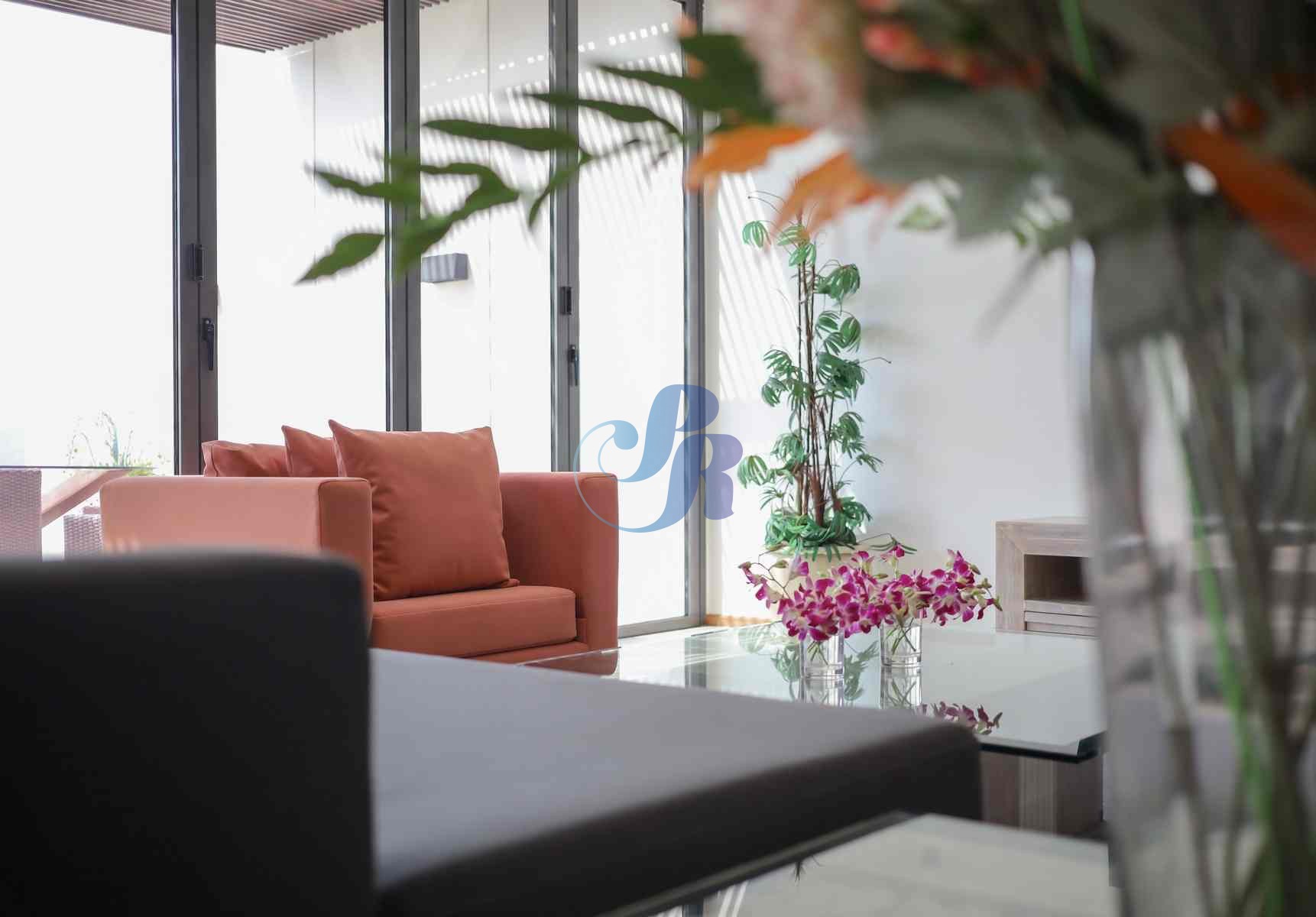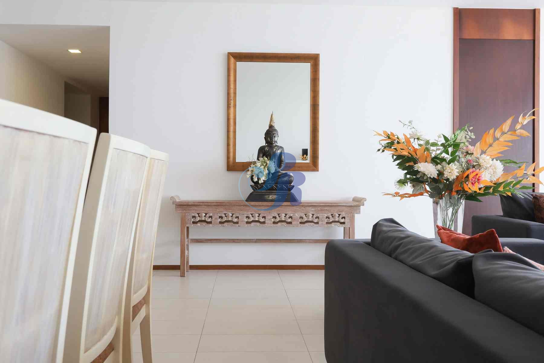 This elegant two-bedroom apartment spans 226 sqm with seamless indoor and outdoor living areas. The living room is tastefully furnished with a comfortable sofa and large TV, complemented by natural light through floor-to-ceiling sliding doors.