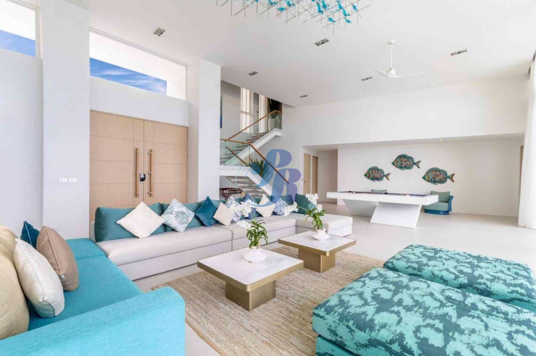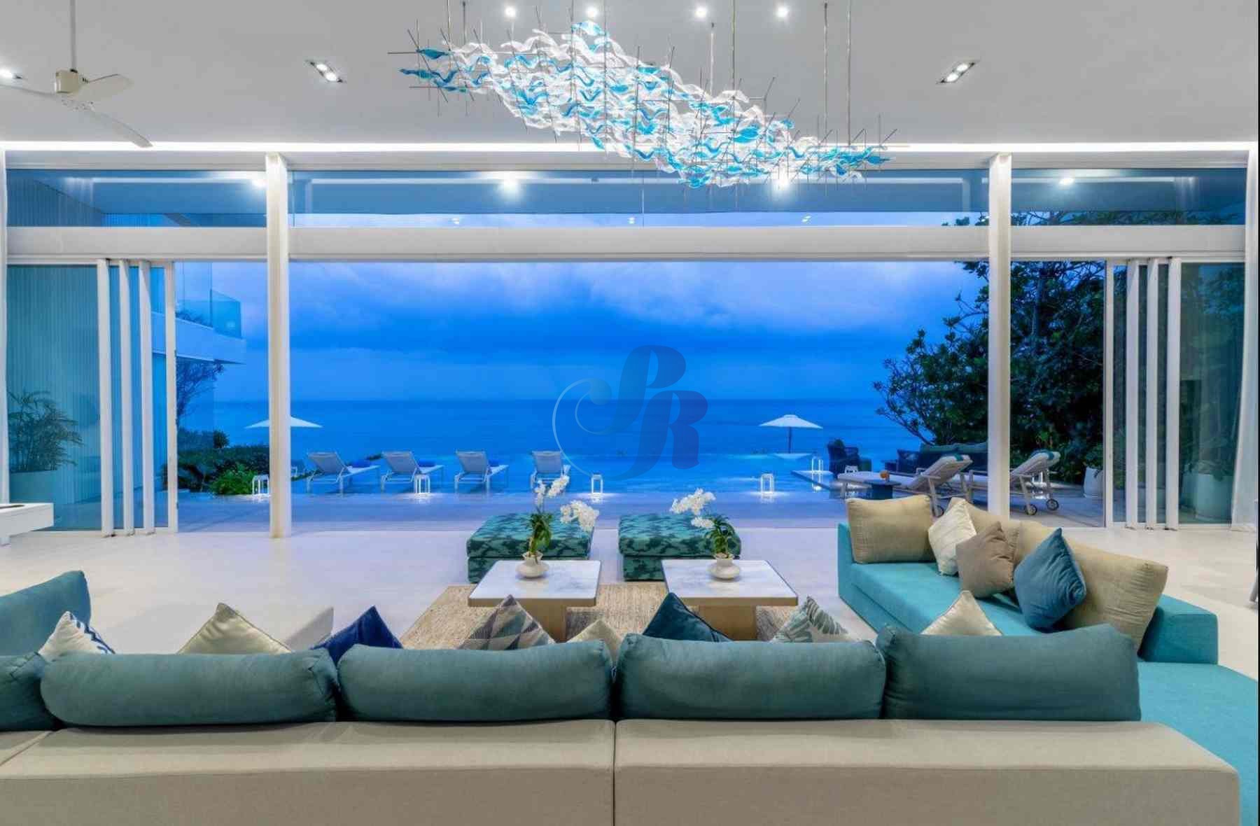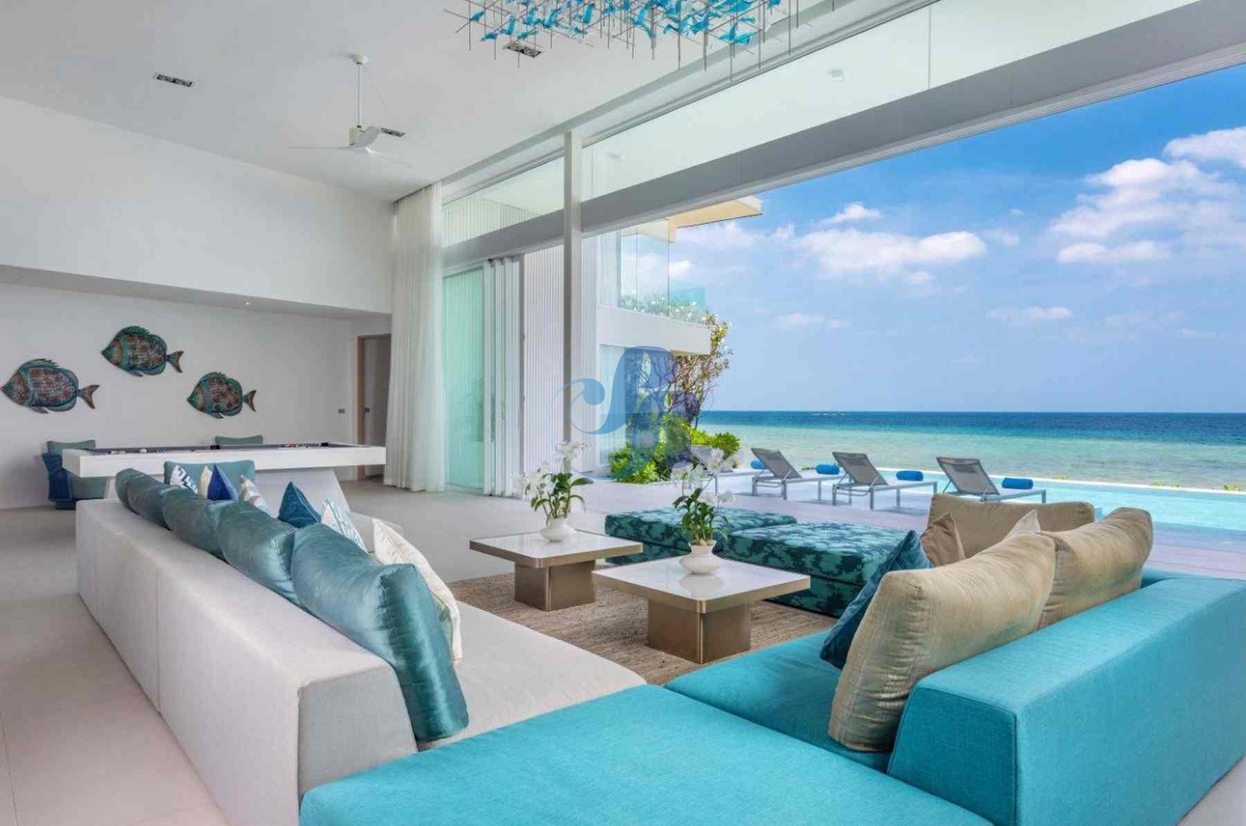 Designed to echo the beauty of the surrounding sea and sky, the villa blends contemporary elegance with relaxed island living. The expansive, light-filled living area is anchored by a striking abstract seascape and styled in calming blue-and-white tones. Floor-to-ceiling glass doors open seamlessly onto a breezy veranda, revealing an infinity-edge swimming pool, the golden beach beyond, and uninterrupted ocean and sunset views.