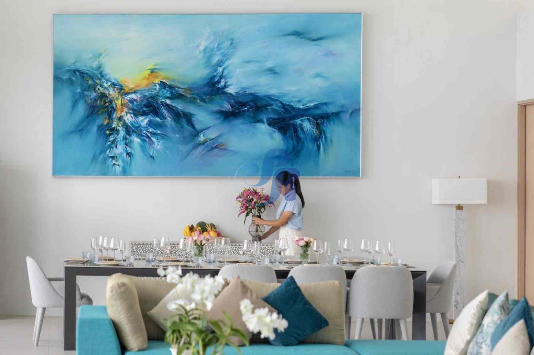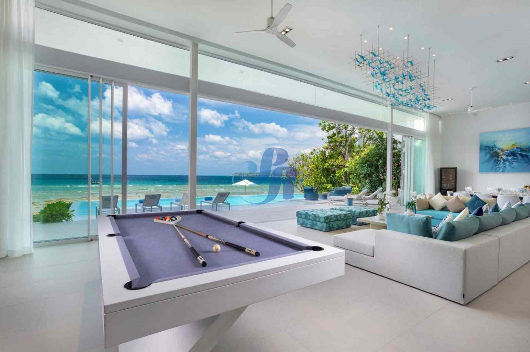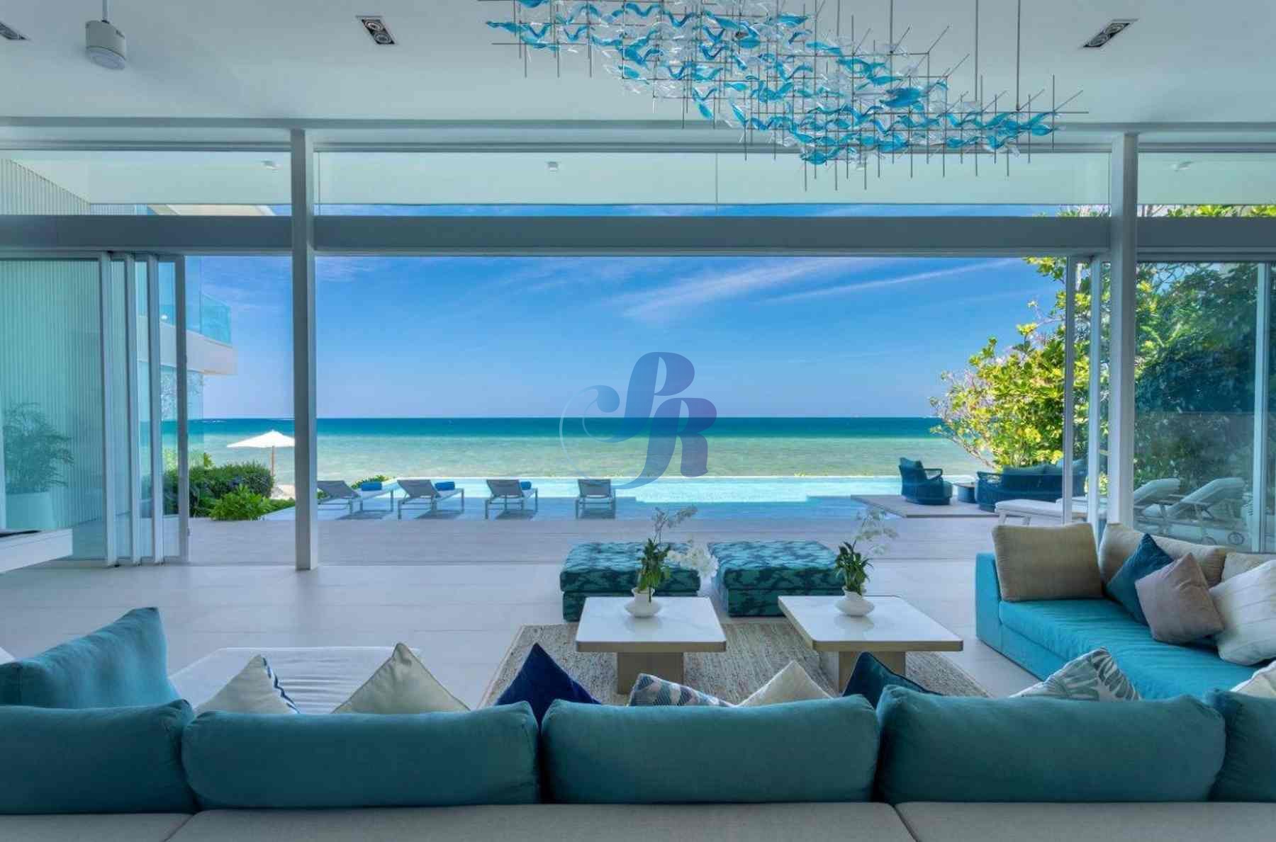 Designed to echo the beauty of the surrounding sea and sky, the villa blends contemporary elegance with relaxed island living. The expansive, light-filled living area is anchored by a striking abstract seascape and styled in calming blue-and-white tones. Floor-to-ceiling glass doors open seamlessly onto a breezy veranda, revealing an infinity-edge swimming pool, the golden beach beyond, and uninterrupted ocean and sunset views.