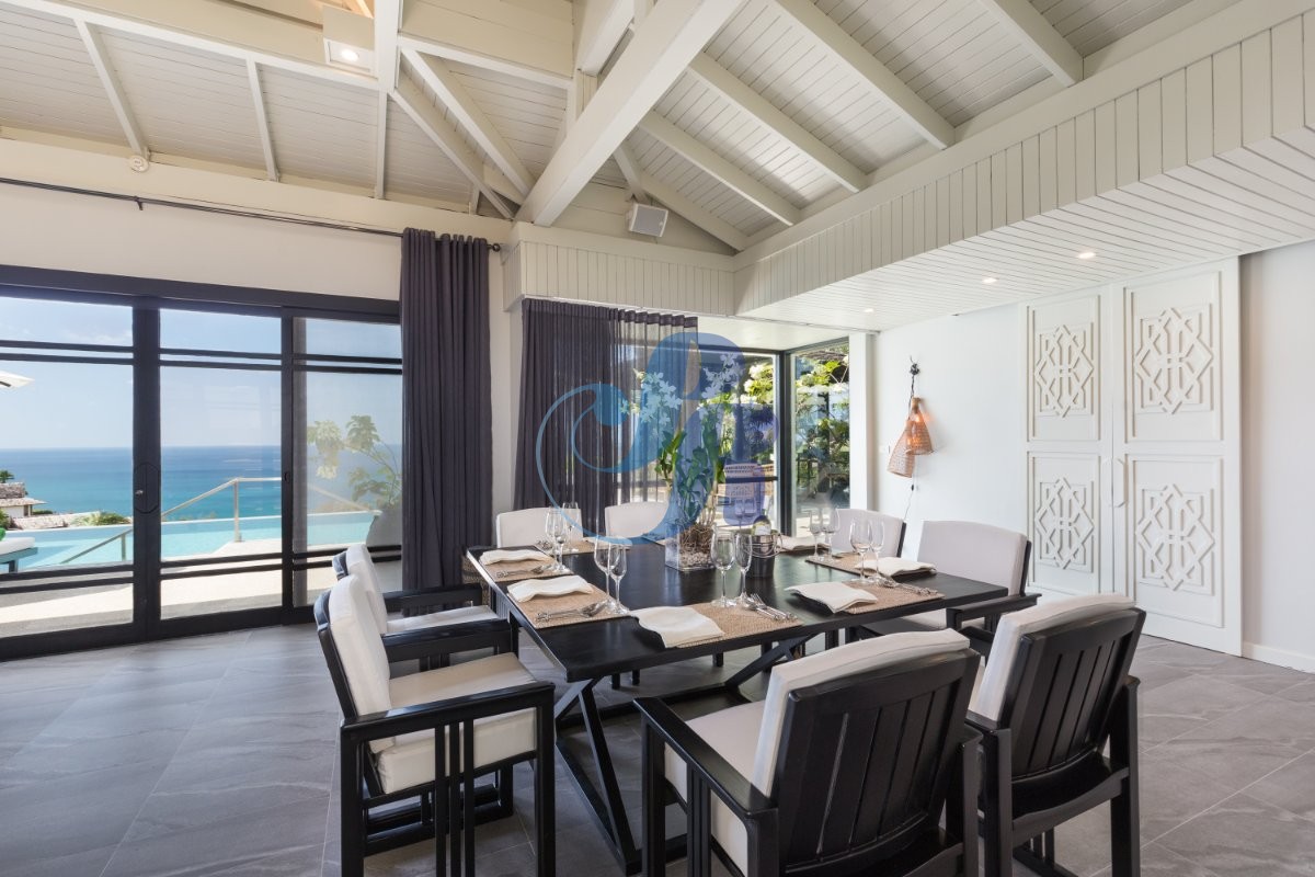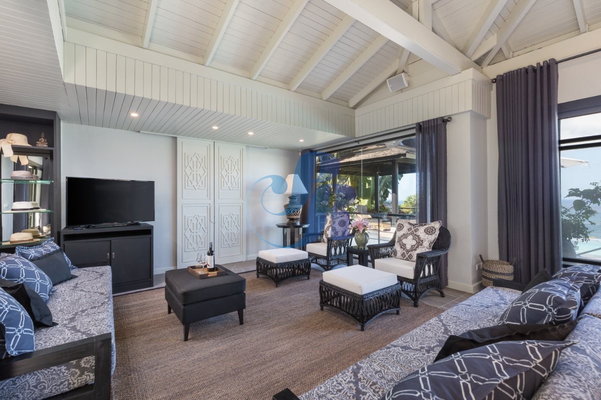 The upper level forms the heart of the home, featuring dramatic cathedral ceilings, expansive ocean vistas, and both formal and informal living and dining spaces. Two generous master suites are also located on this level. The private 10m x 5m swimming pool is perfectly positioned to capture panoramic sea views and flows seamlessly from the living areas onto the main terrace—ideal for entertaining or relaxed tropical living.