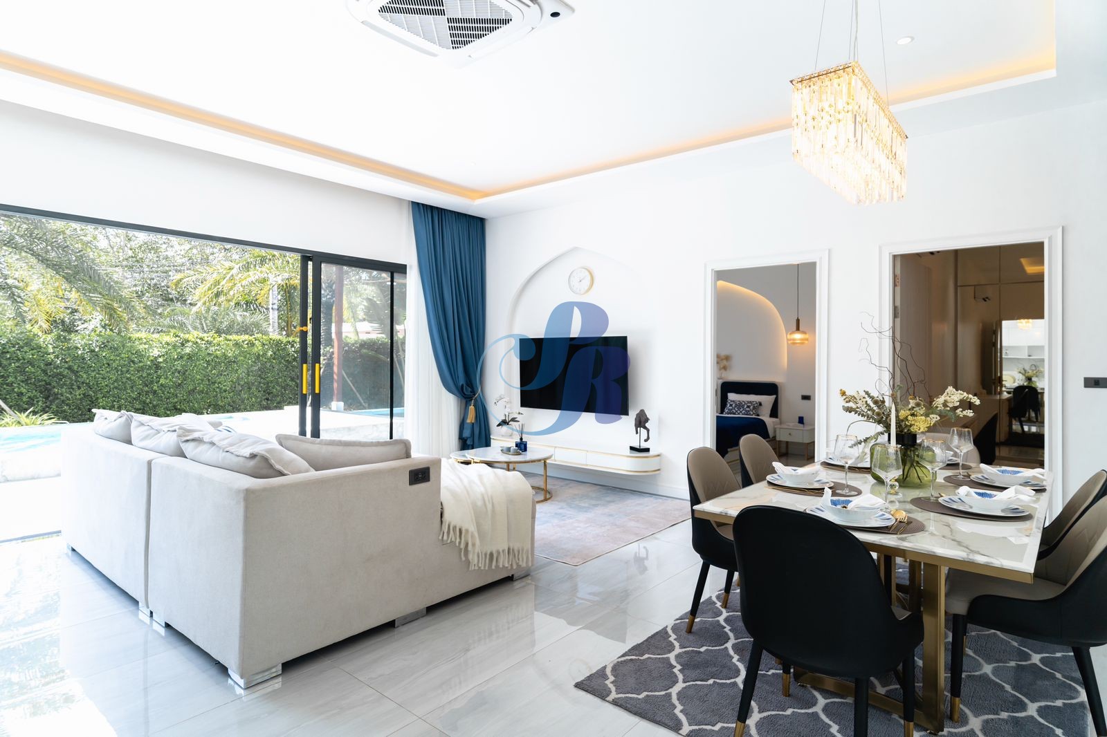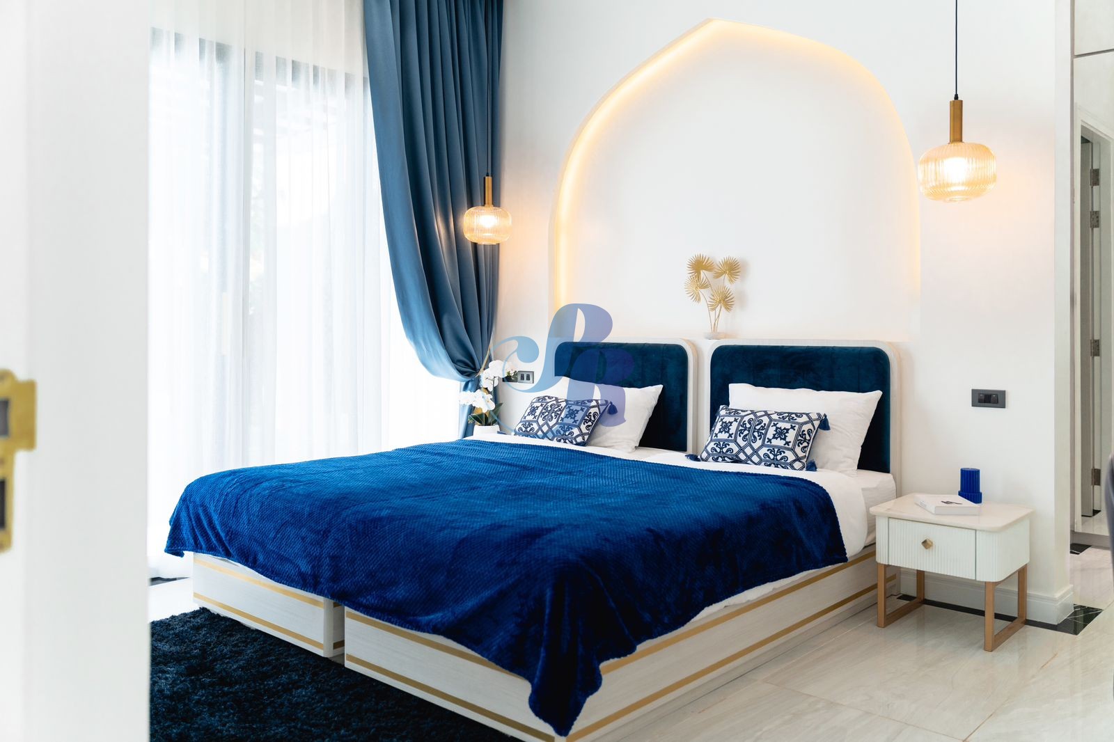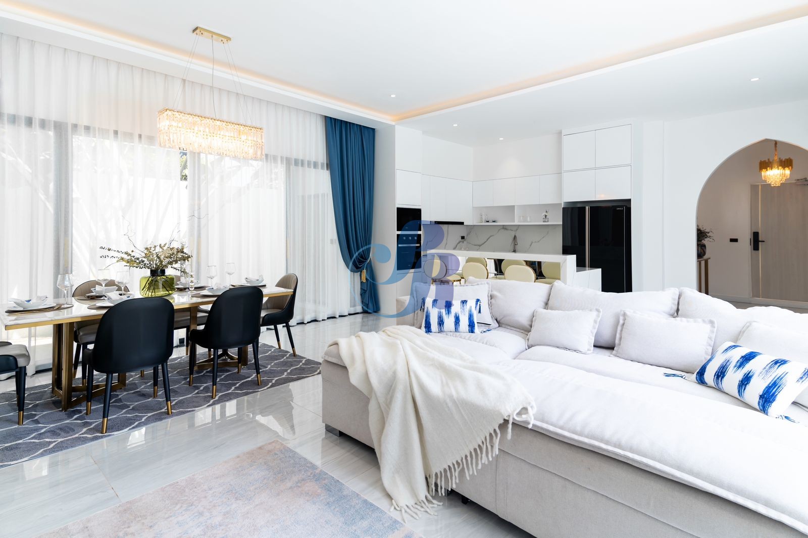 The property features 3 spacious bedrooms and 3.5 bathrooms, with a generous built-up area of 402 sqm on a 407 sqm land plot. Open-plan living and dining areas are enhanced by high ceilings and floor-to-ceiling glass, allowing abundant natural light and seamless access to the terrace, landscaped garden, and private swimming pool. The villa is ready to move in and includes a furniture package.