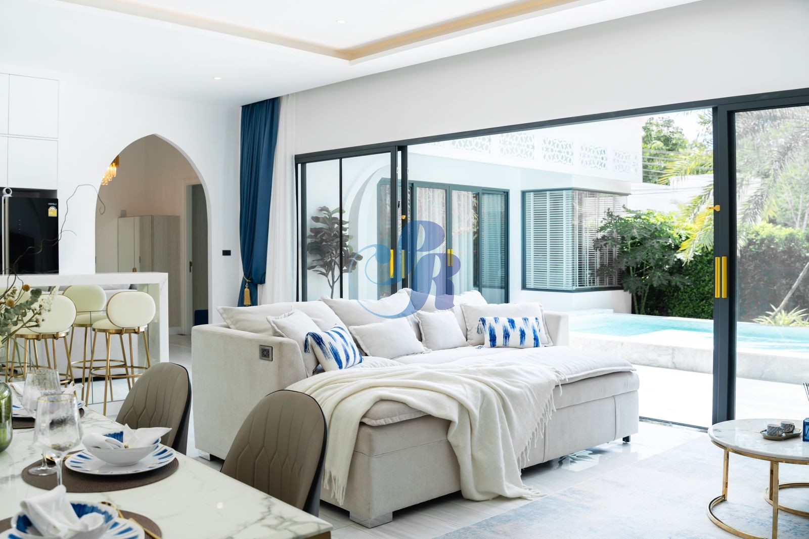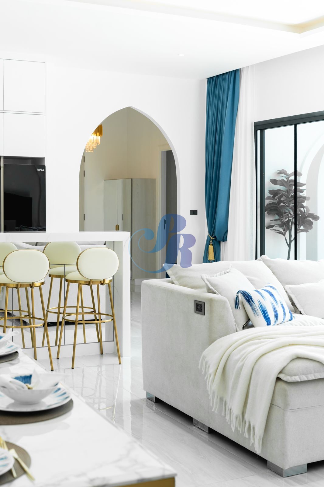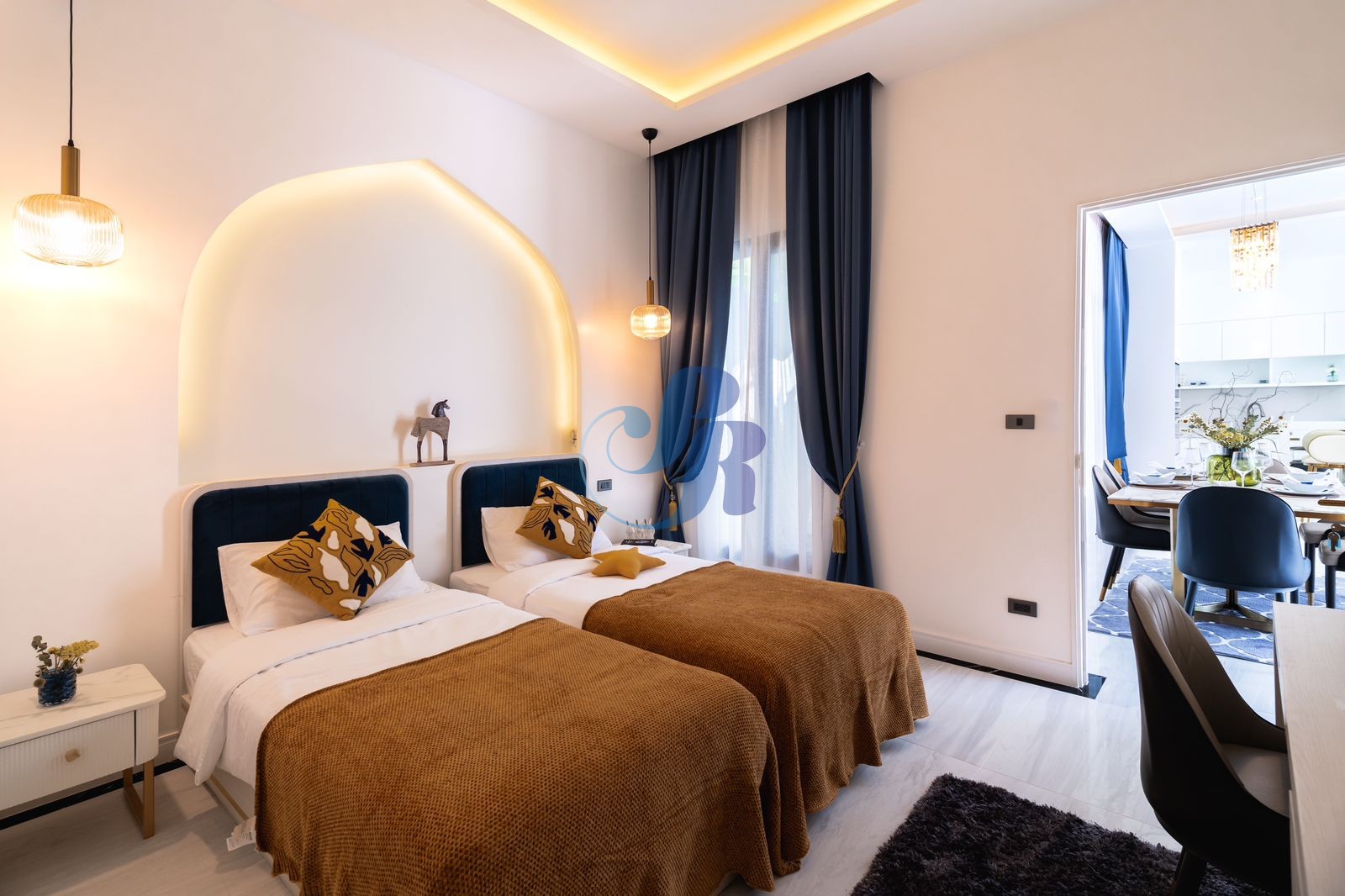 The property features 3 spacious bedrooms and 3.5 bathrooms, with a generous built-up area of 402 sqm on a 407 sqm land plot. Open-plan living and dining areas are enhanced by high ceilings and floor-to-ceiling glass, allowing abundant natural light and seamless access to the terrace, landscaped garden, and private swimming pool. The villa is ready to move in and includes a furniture package.