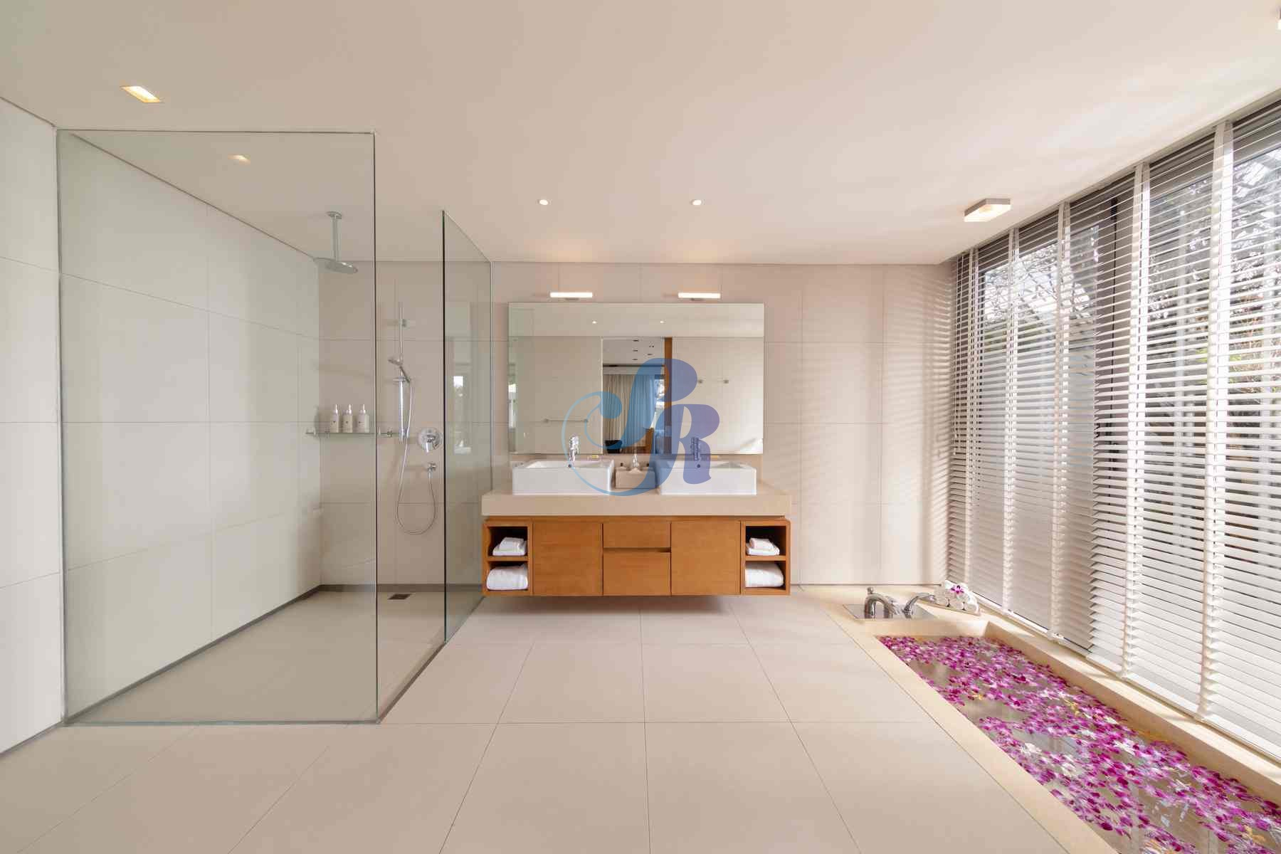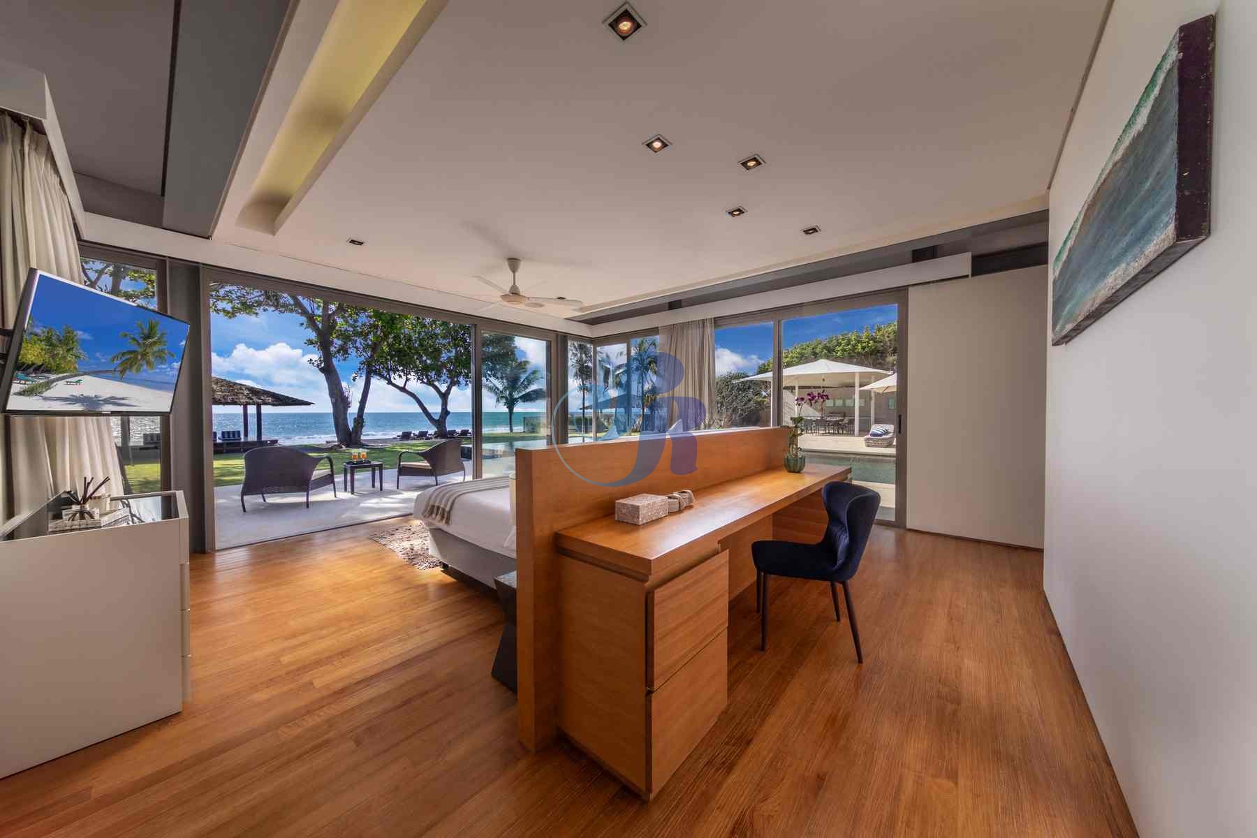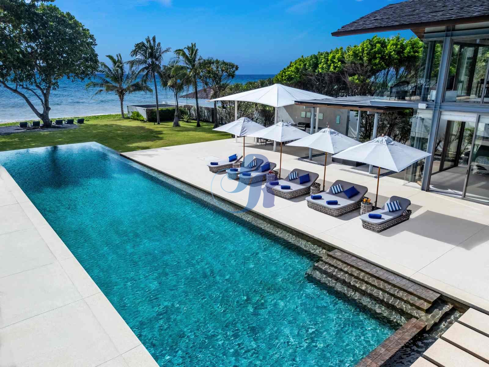 The villa’s 25-meter saltwater infinity pool appears to merge with the ocean horizon. Surrounded by lush gardens, sun loungers, and umbrellas, the outdoor spaces also include:
