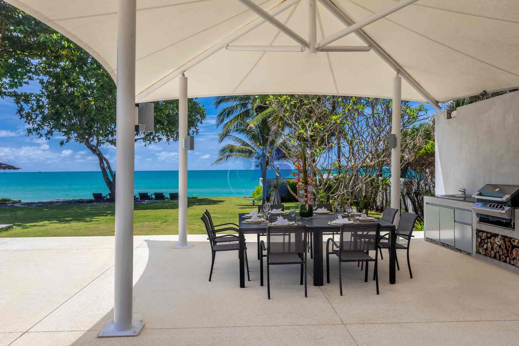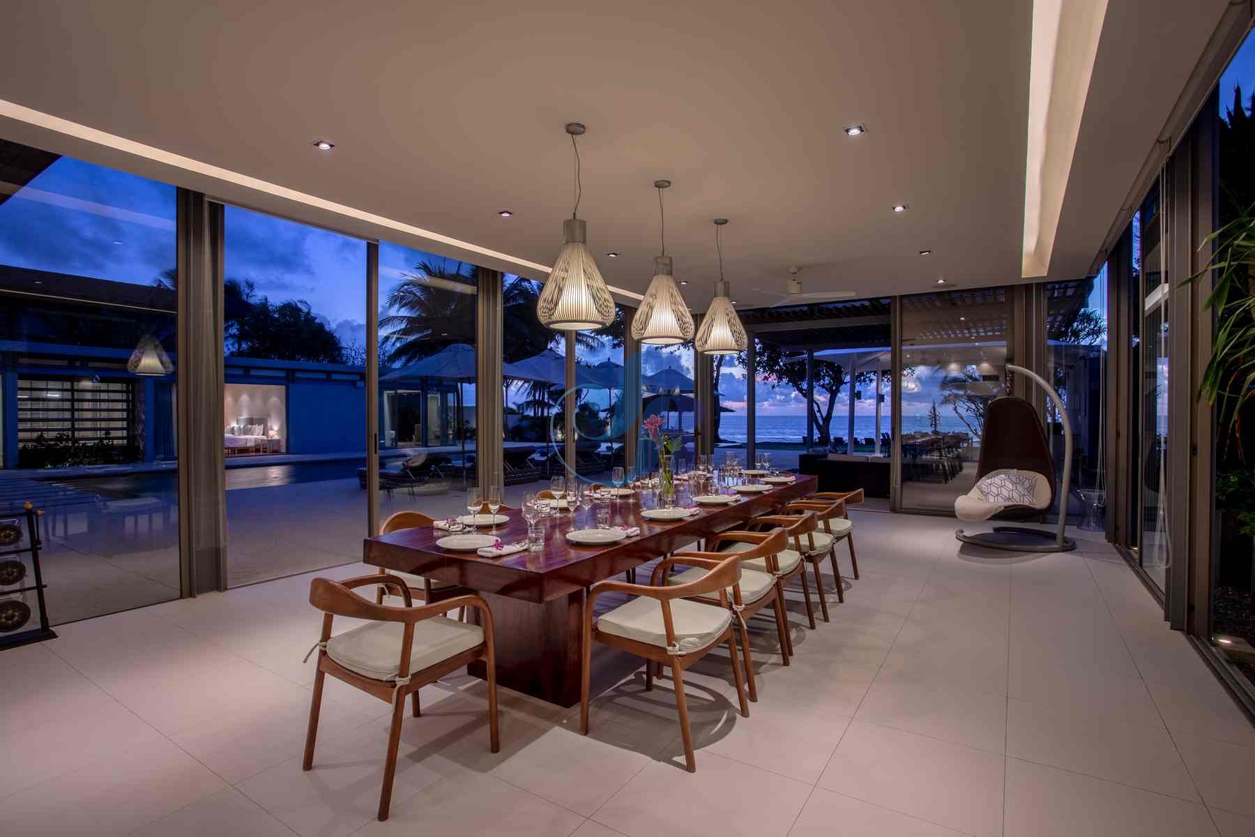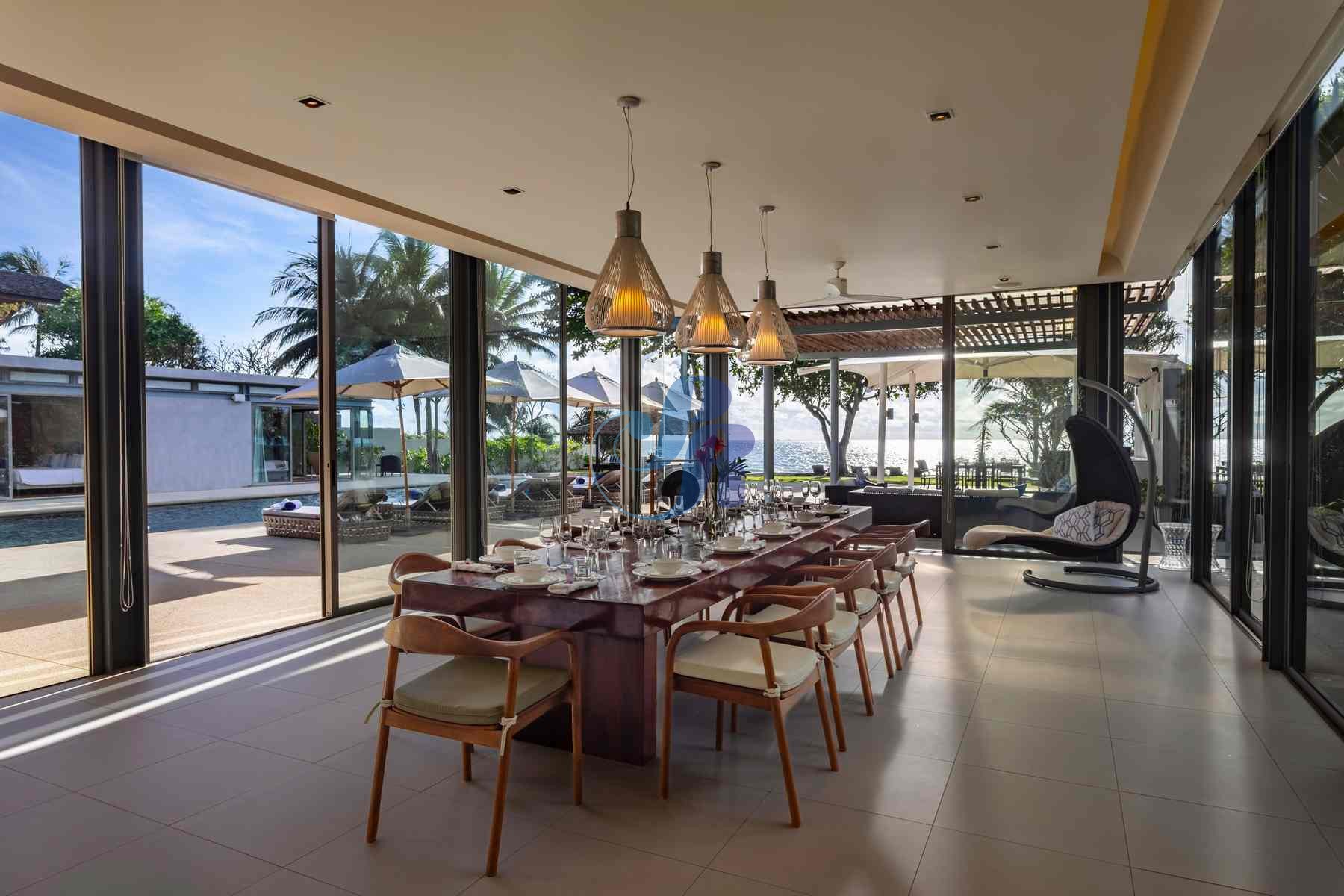 A chic dining space seats up to 14 guests, where a dedicated private chef prepares exquisite Thai and international cuisine from the fully equipped modern kitchen.