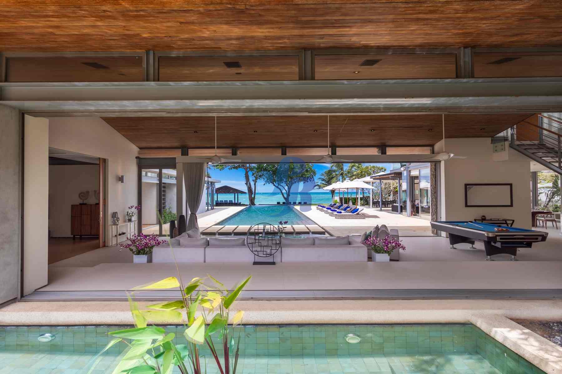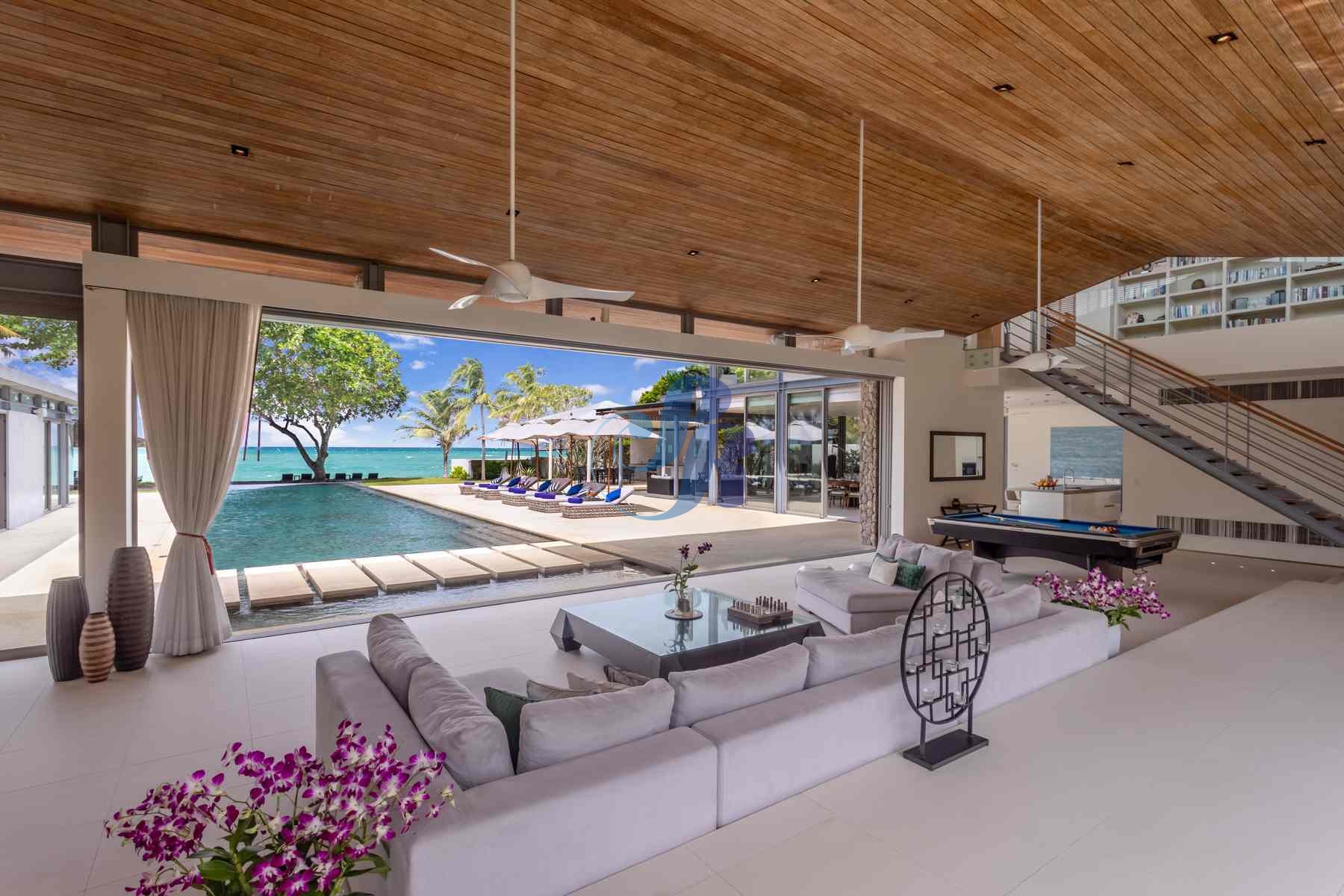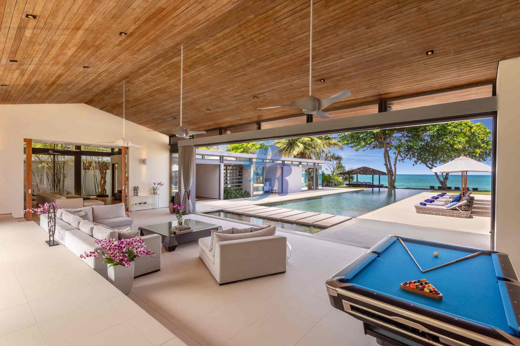 The sun-drenched open-plan living area showcases plush furnishings, curated artwork, and a billiards table, flowing seamlessly through floor-to-ceiling glass doors onto a panoramic terrace overlooking the Andaman Sea.