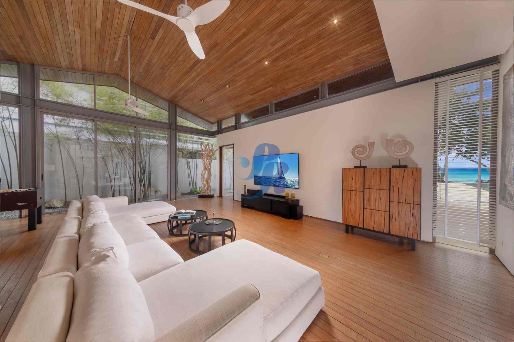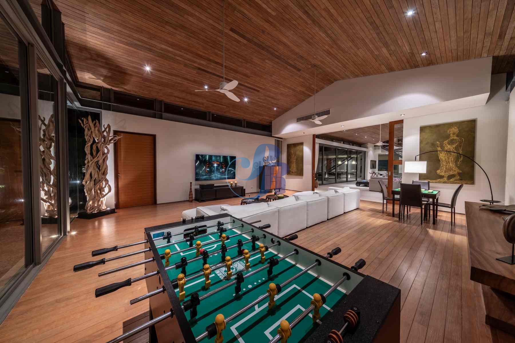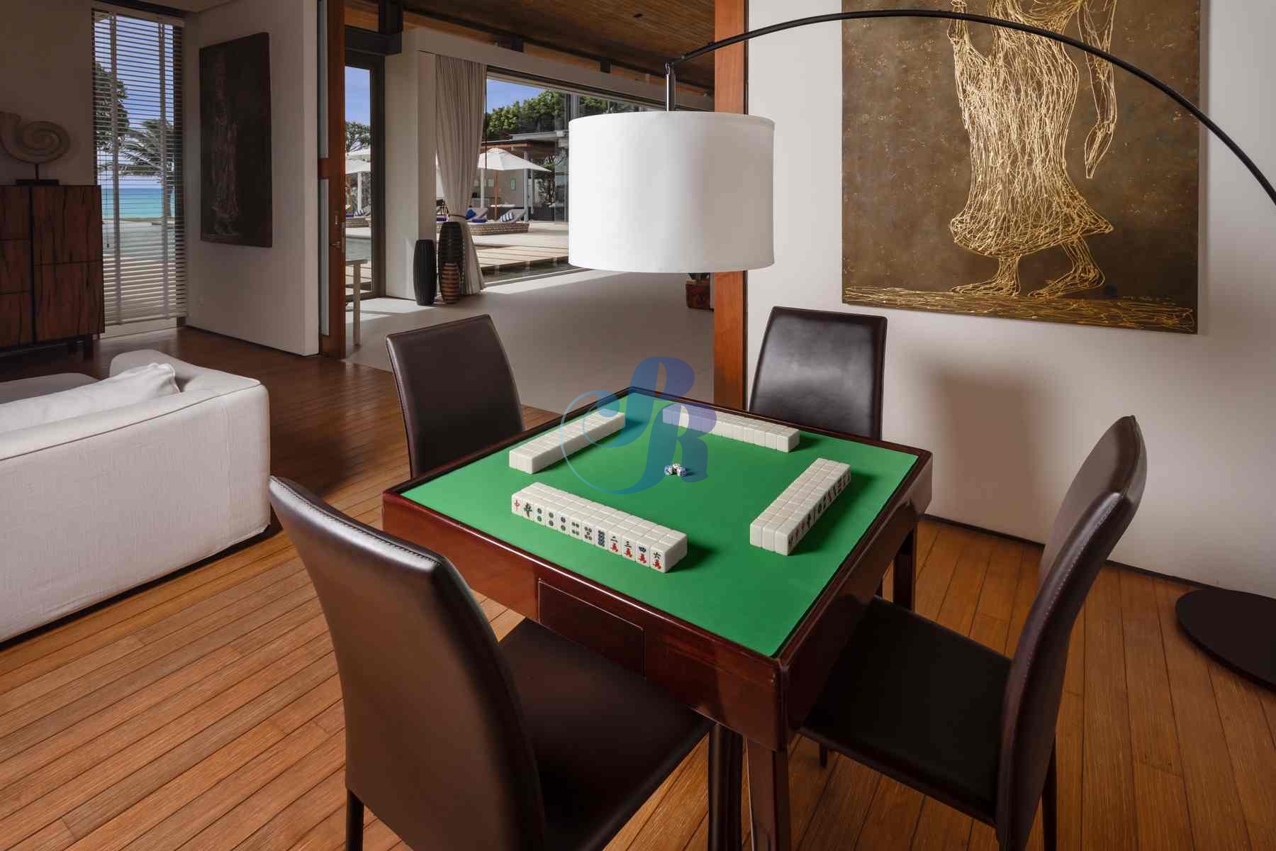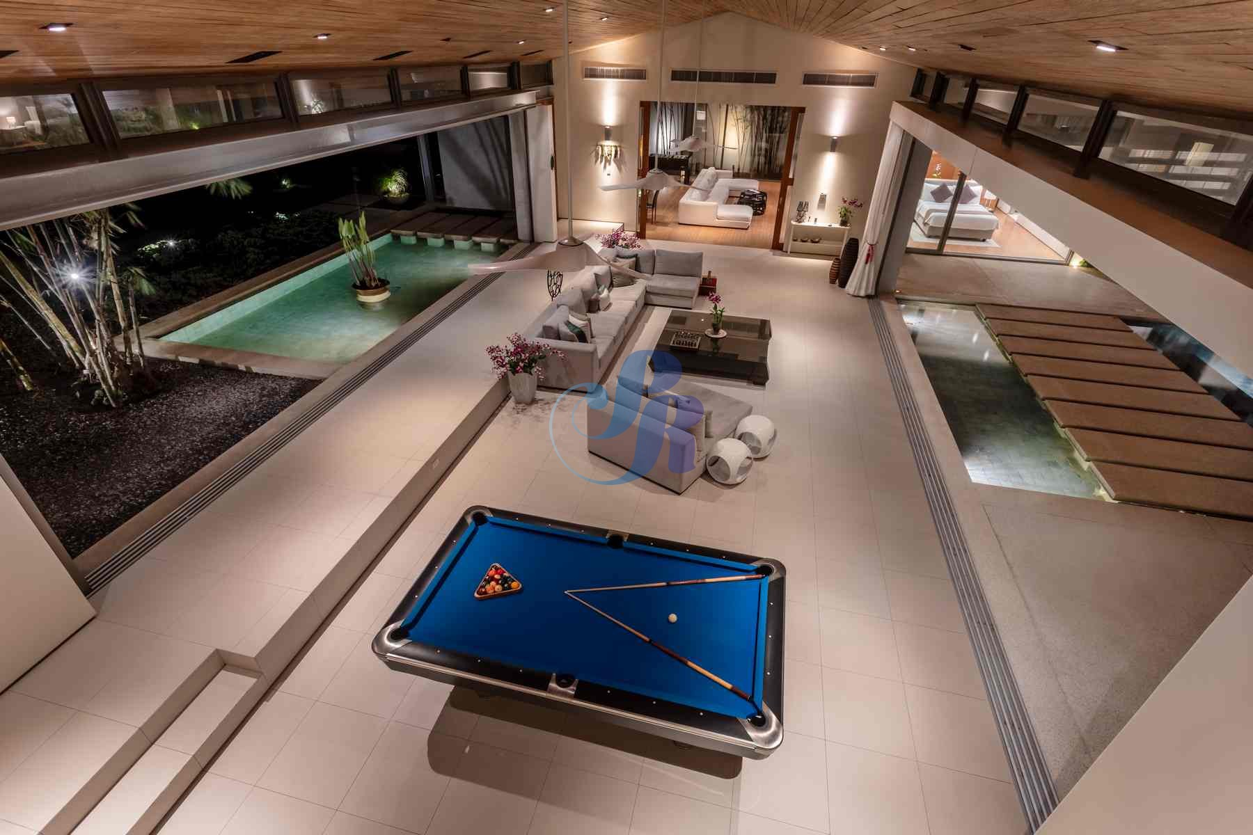 The sun-drenched open-plan living area showcases plush furnishings, curated artwork, and a billiards table, flowing seamlessly through floor-to-ceiling glass doors onto a panoramic terrace overlooking the Andaman Sea.