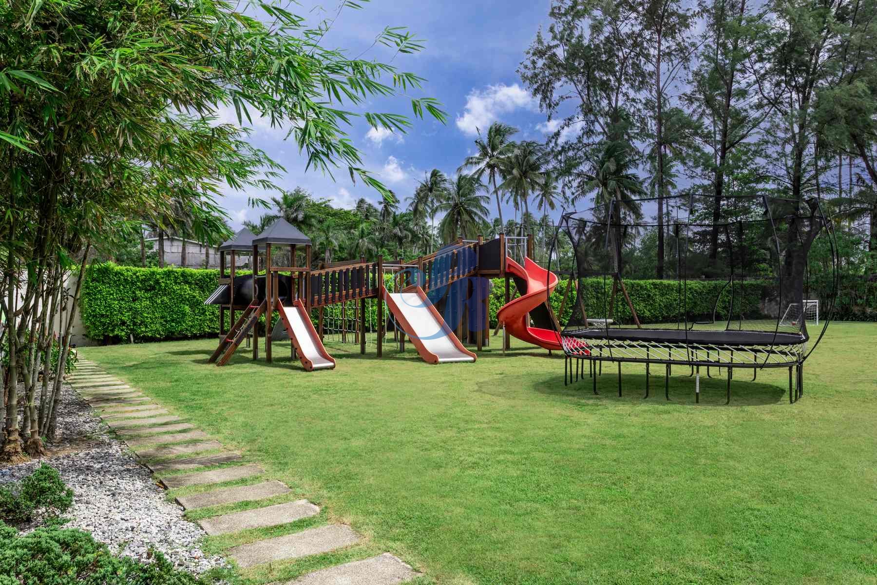 Expansive lawn with playground and trampoline