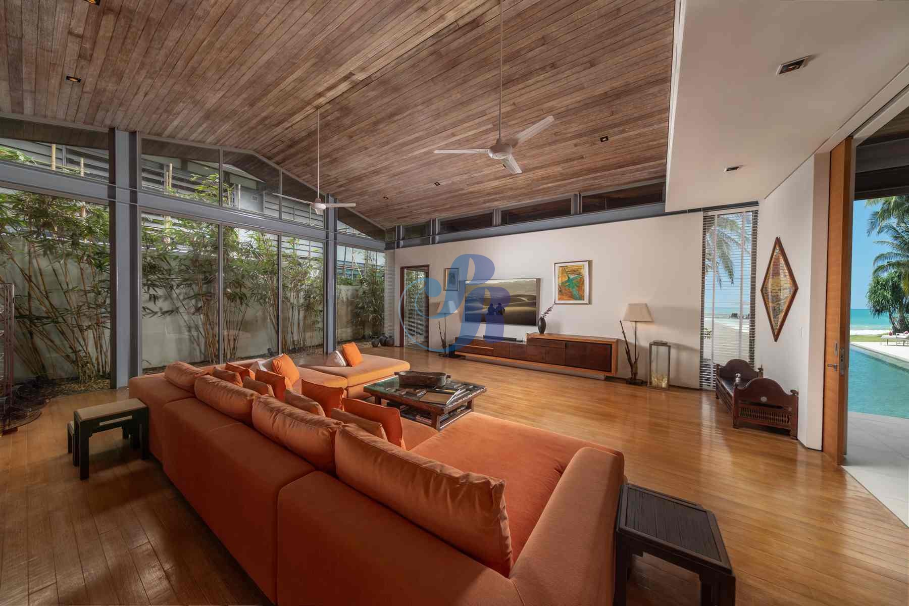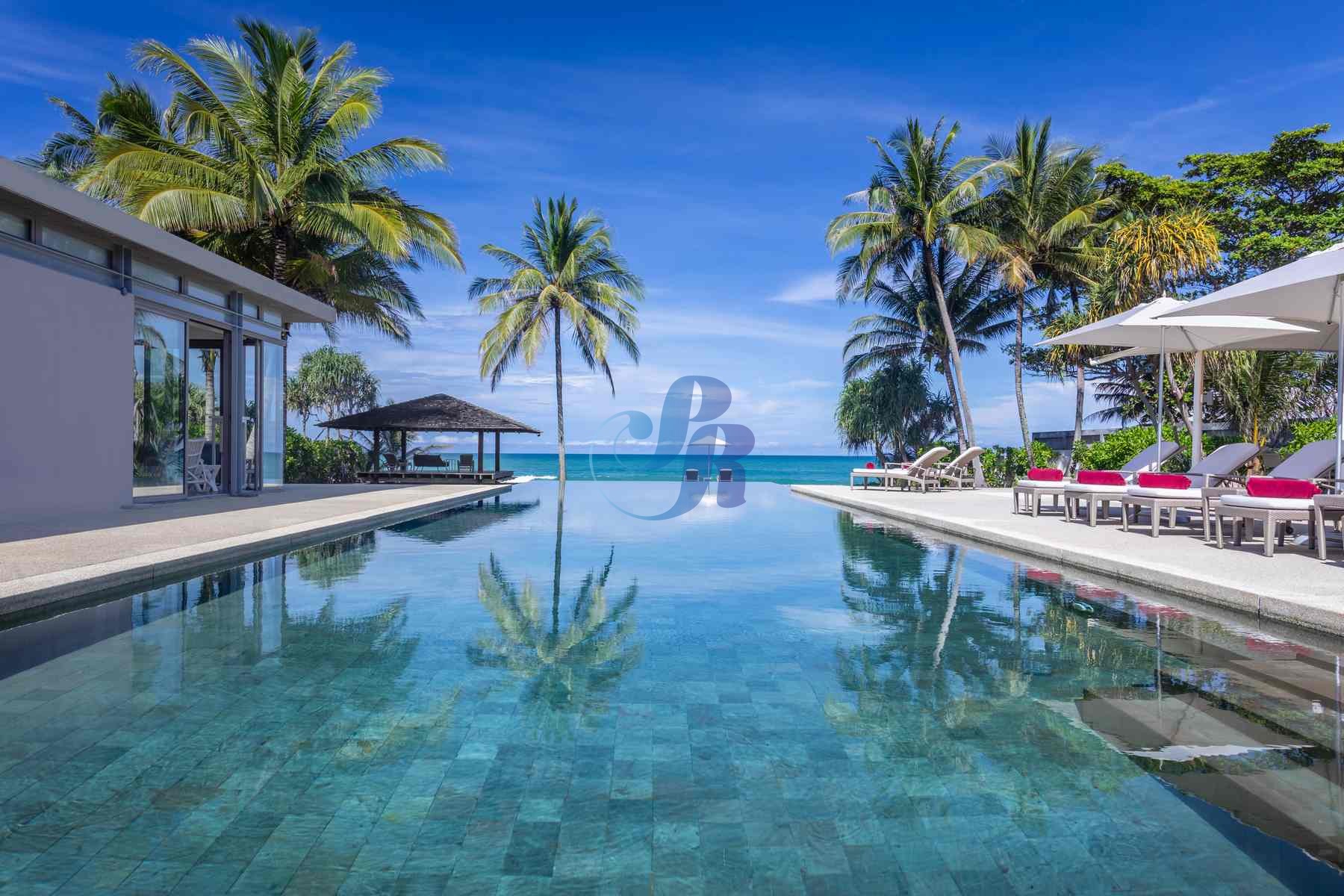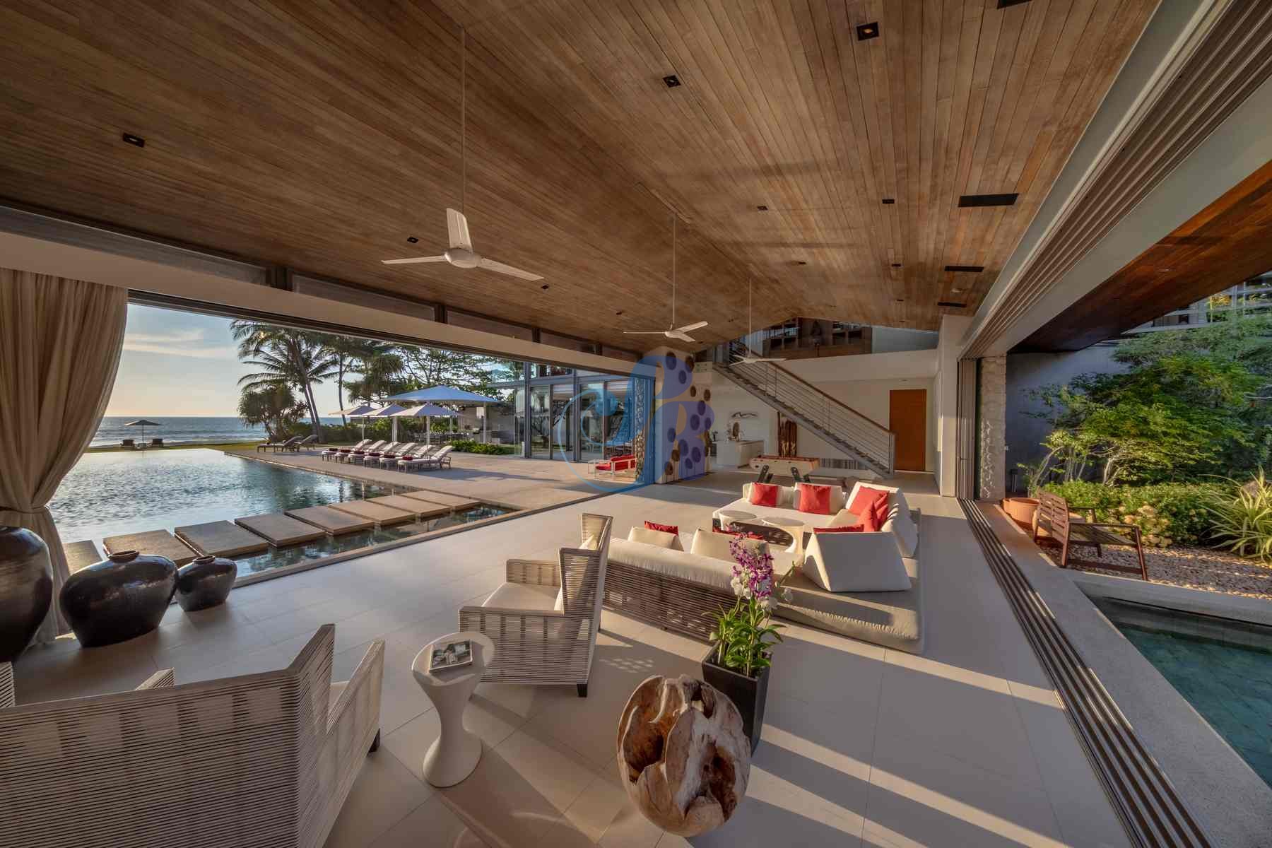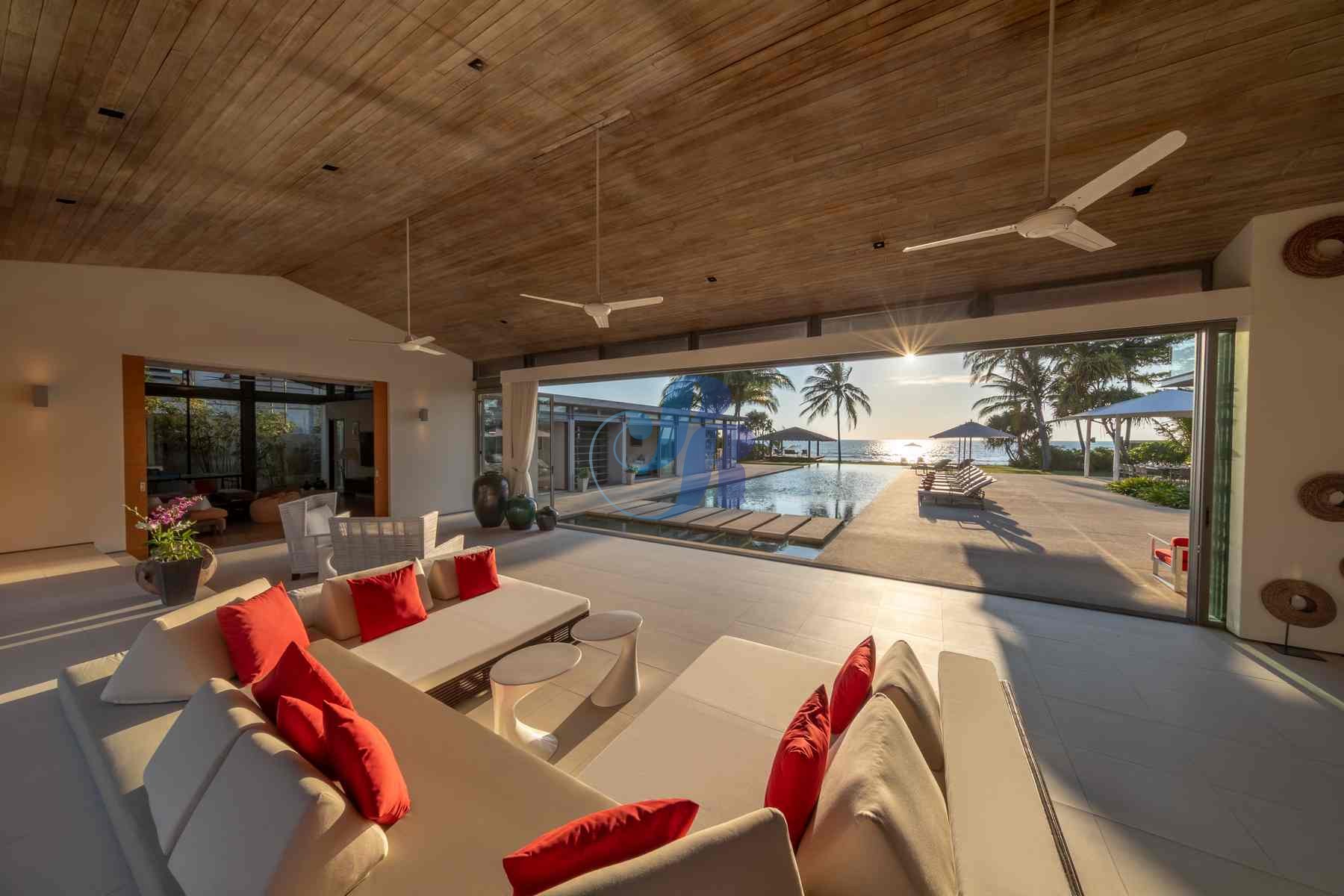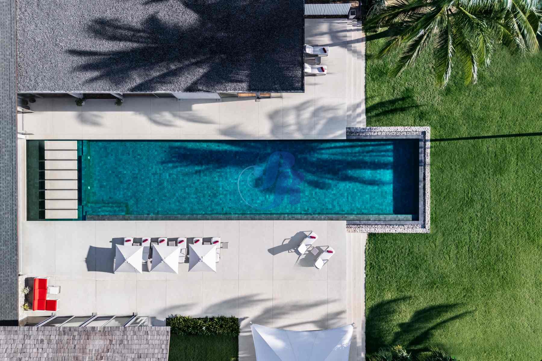 A striking 25-meter saltwater infinity pool forms the heart of the villa, surrounded by sun loungers, umbrellas, and lush tropical landscaping—perfect for leisurely swims or sun-soaked afternoons. Expansive glass doors open airy living spaces onto panoramic sea views and manicured gardens, seamlessly connecting indoor and outdoor living.
